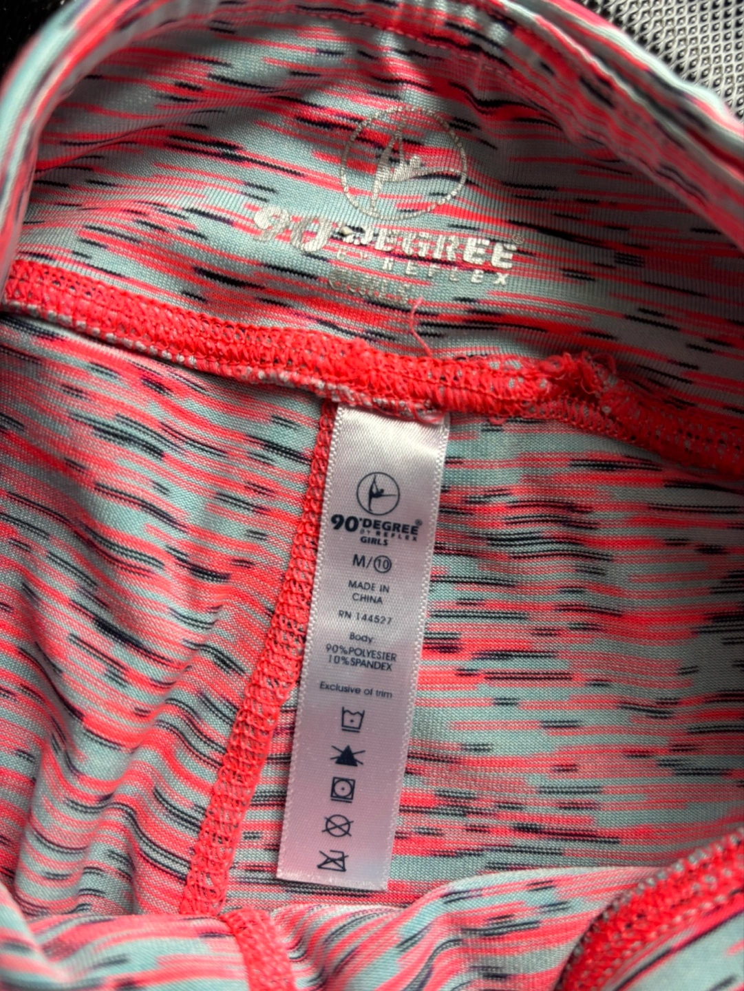 Girls' size medium (10) leggings. Coral and teal colour block pattern. 90% polyester, 10% spandex. Machine washable.