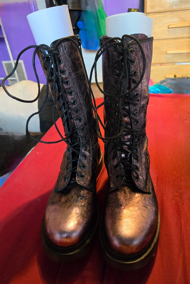 Women's Dr. Martens tall boots. Metallic leather upper. Lace-up closure with side zipper. Durable sole. Excellent for adding flair to any outfit. pet friendly smoke free home
