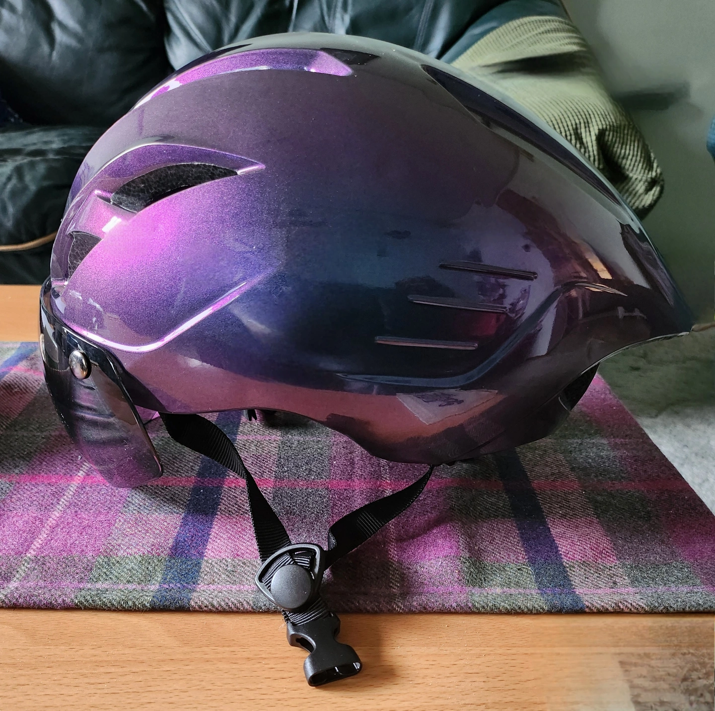 Adult sized bicycle helmet. Features a purple to black ombre finish. Includes a detachable visor. Size large.(59-60cm)or(23,1/4"-23,3/4")