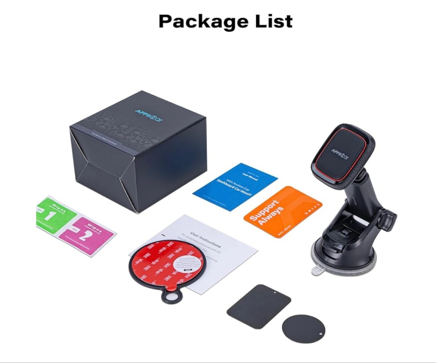 Magnetic phone mount for car windshields. Strong suction cup. Rotatable for optimal viewing. Includes extra adhesive pads. Easy to install.