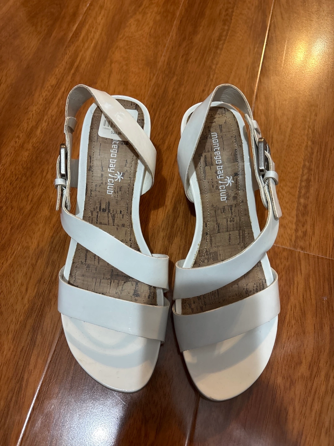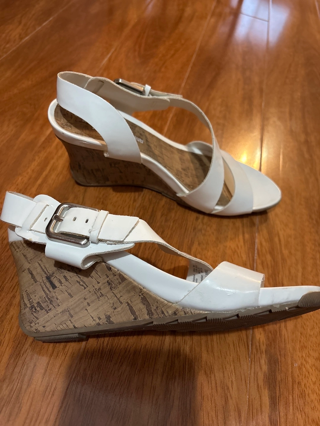 Women's white leather wedge sandals. Cork wedge heel. Buckle closure. Open toe.