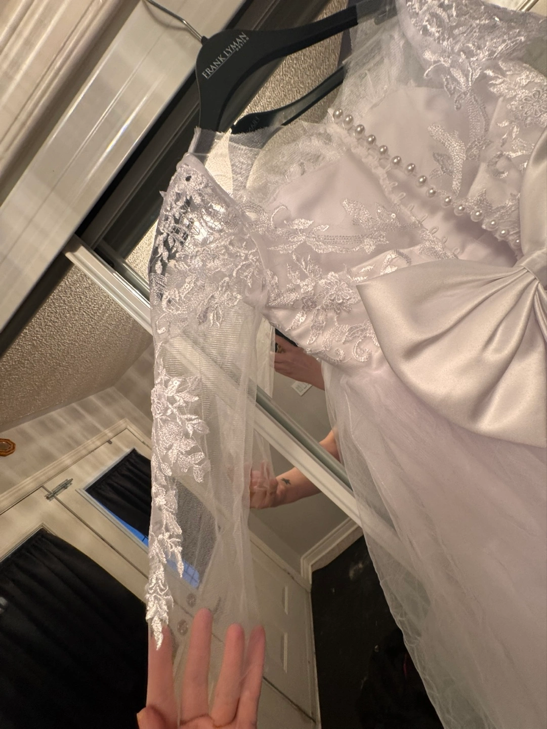 Beautiful white tulle flower girl dress. Lace details on sleeves and bodice. Size 6. Bow in the back. Long sleeves. Perfect for weddings or special occasions. Brand new never worn. Too small for my daughter. Size 7-8