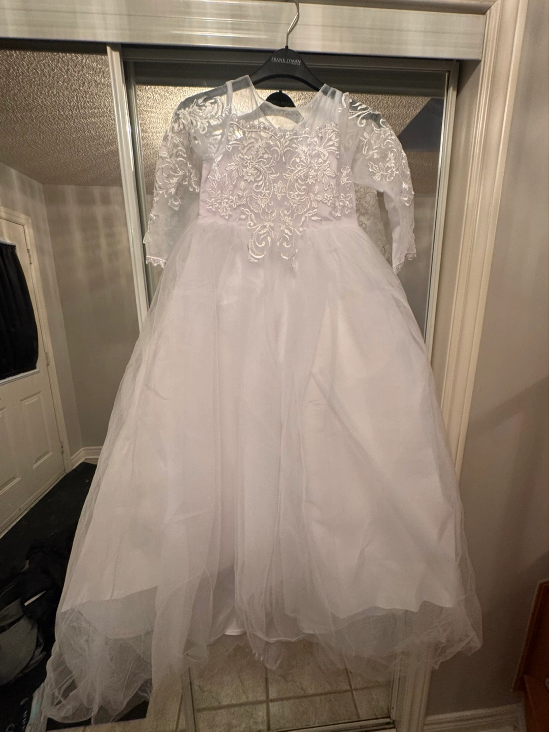 Beautiful white tulle flower girl dress. Lace details on sleeves and bodice. Long sleeves. Perfect for weddings or special occasions. Brand new never worn. Too small for my daughter. Size 7-8