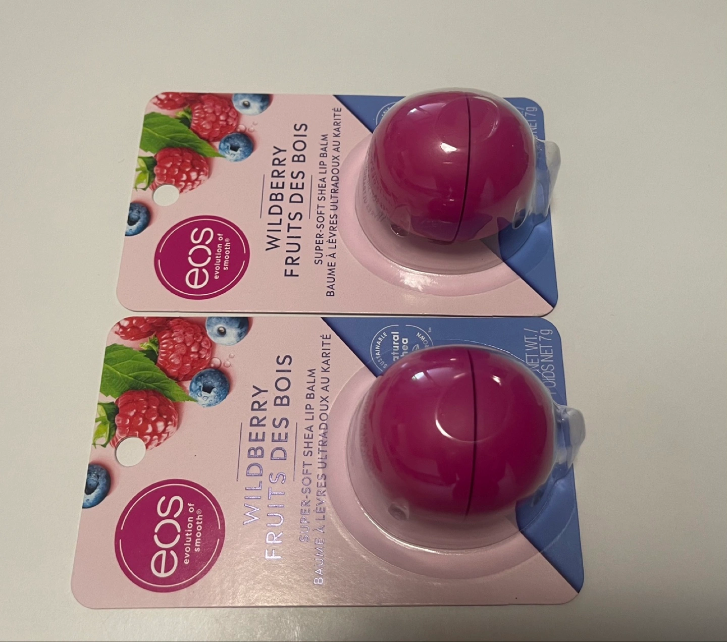 Two new EOS Wildberry lip balm spheres. Super-soft shea lip balm.