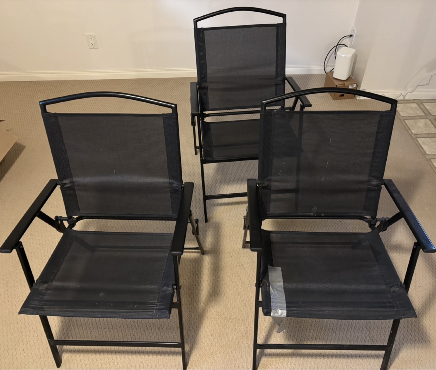 I have four (the other one is not in the picture) black metal folding chairs. Mesh seating. Good for indoor or outdoor use. Minor wear. For free!