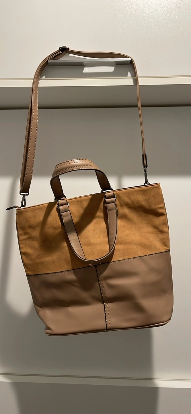 Beige and brown tote bag. Features two top handles and a detachable shoulder strap. Zip closure. Interior lining. Excellent condition.