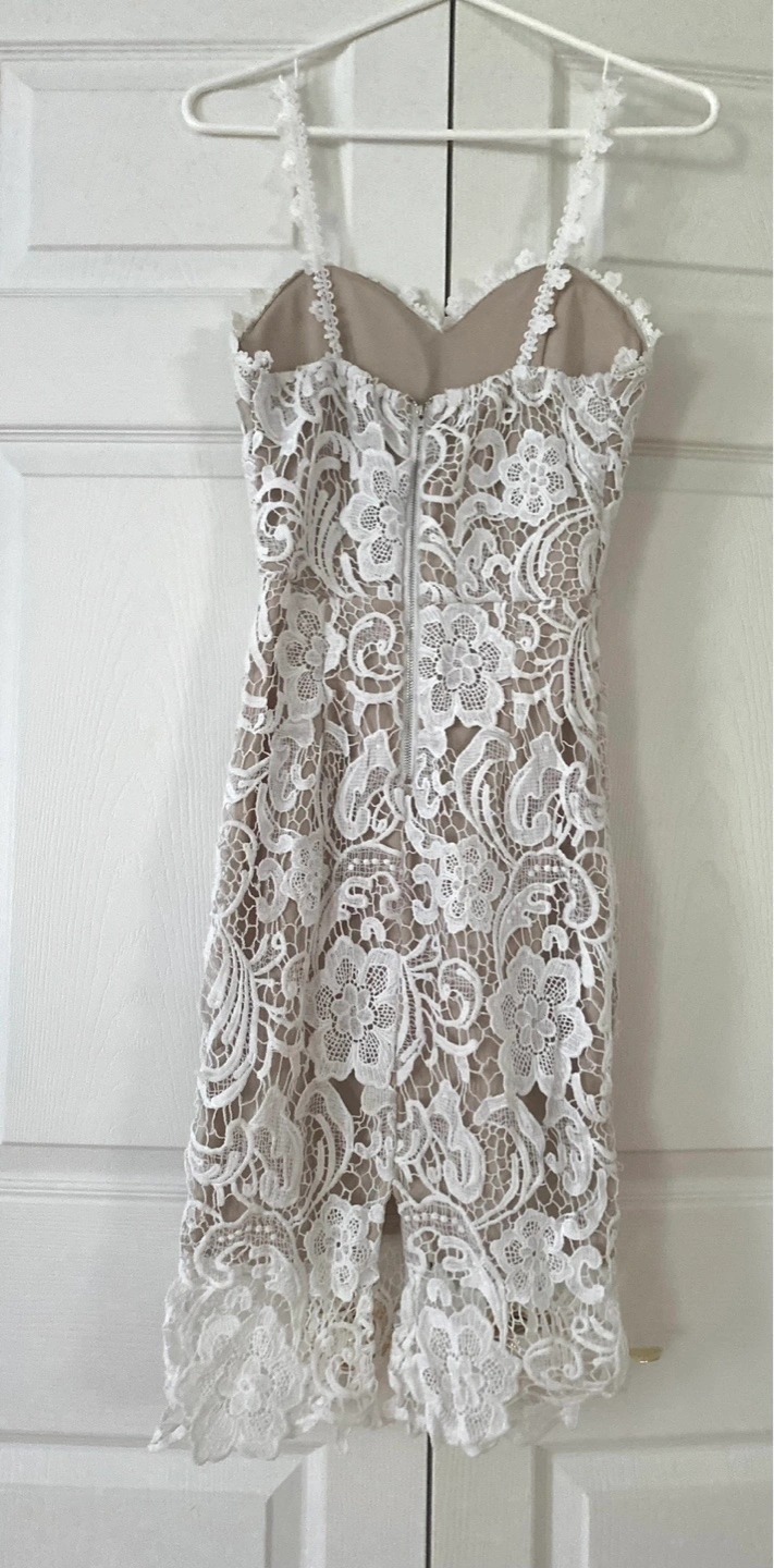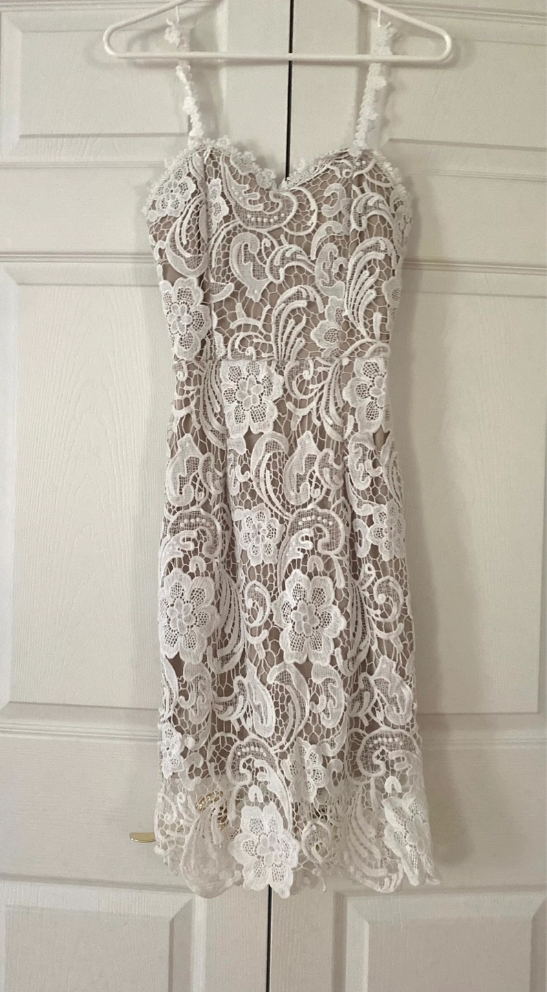 Beautiful m lace dress. Features spaghetti straps and a fitted silhouette. Scalloped hemline. Perfect for a special occasion.