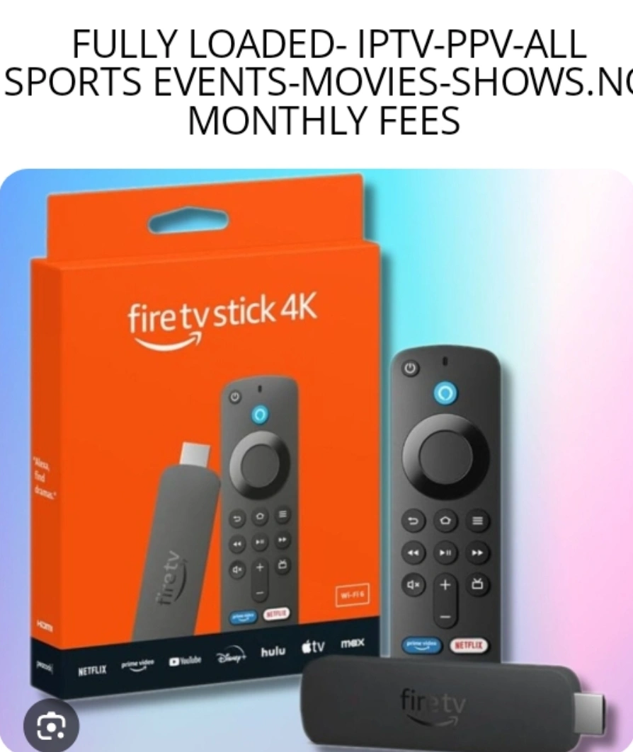 Fully loaded IPTV-PPV streaming device. Access to all sports events, movies, and shows. No monthly fees. Includes Fire TV Stick 4K and voice remote. Pre-loaded with numerous channels and apps.