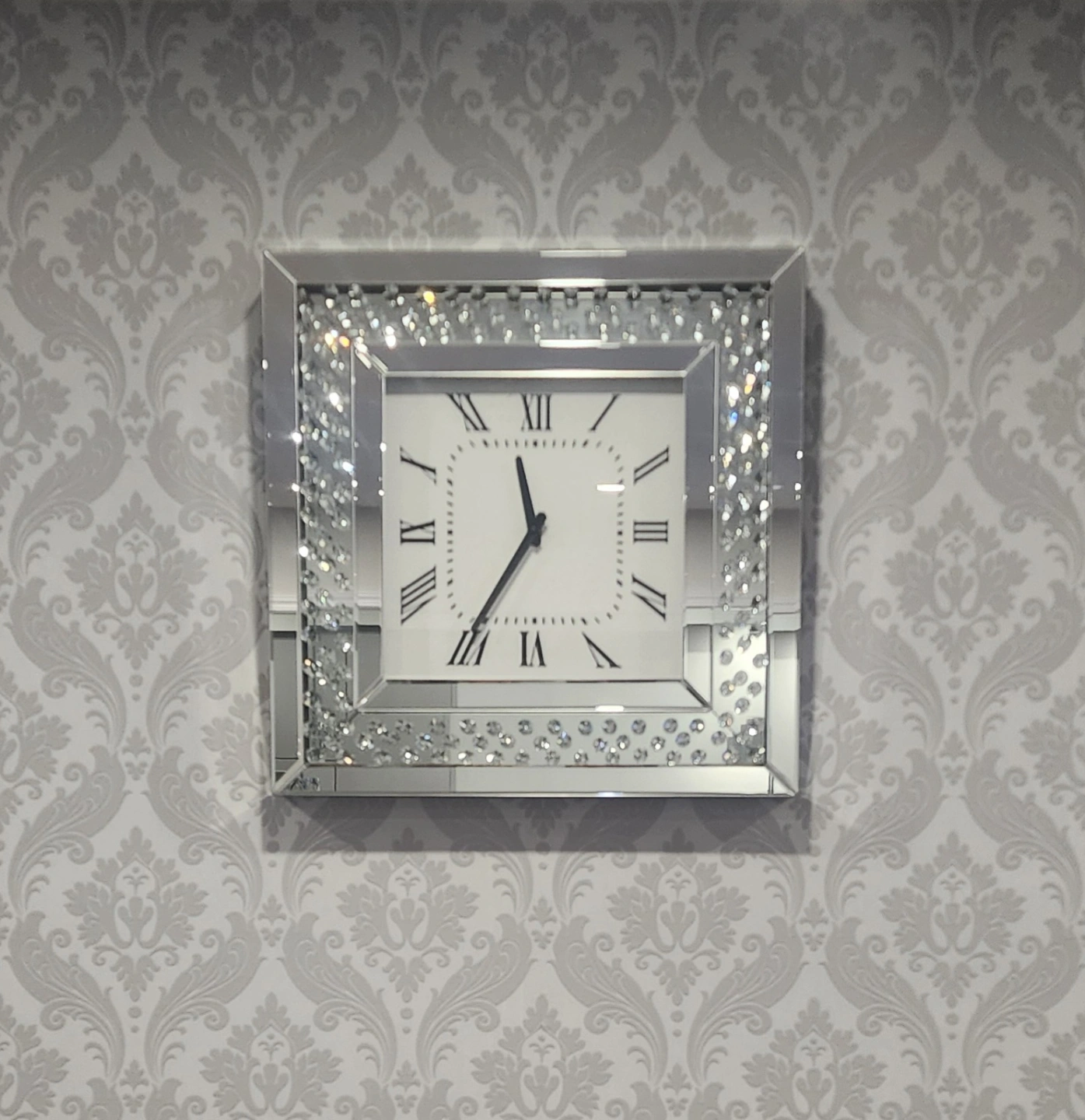 Large square mirrored wall clock. Features a crystal embellishment around the frame. Roman numerals. Clean, modern design. Perfect for adding a touch of glamour to any room.