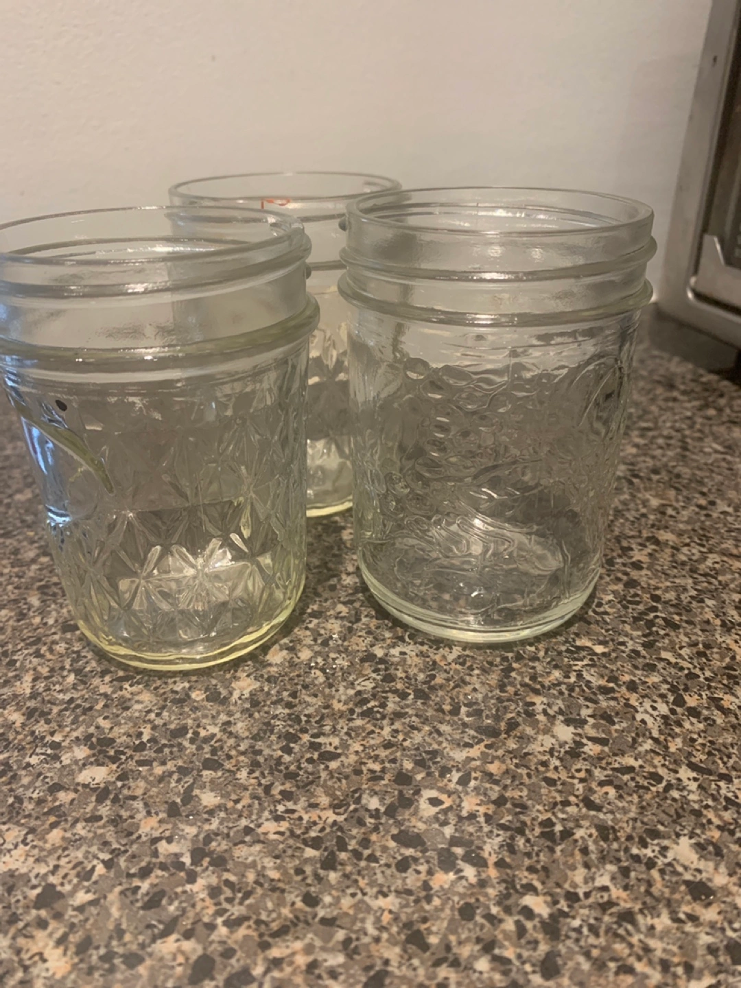 293Set of five empty glass jars. 3 jam jars Perfect for canning, storage, or crafting. Show some minor wear. Pick up only **move out sale - see other items in profile**