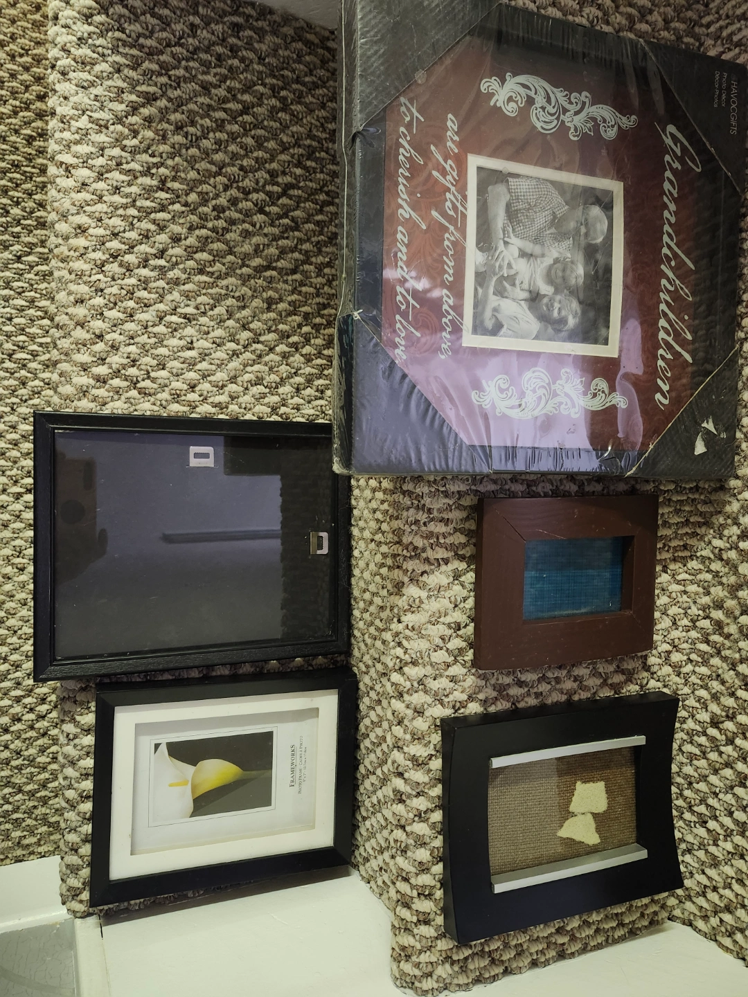 Set of picture frames. Includes a new, boxed Havocgifts framed print featuring grandchildren. Also, three other used picture frames, one black, one dark brown, and one black with a silver accent. Various sizes.