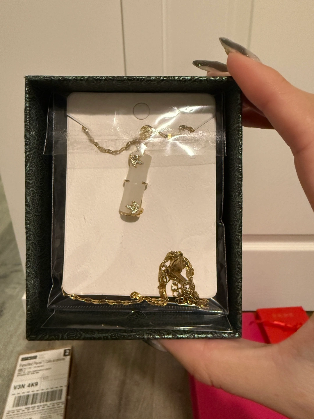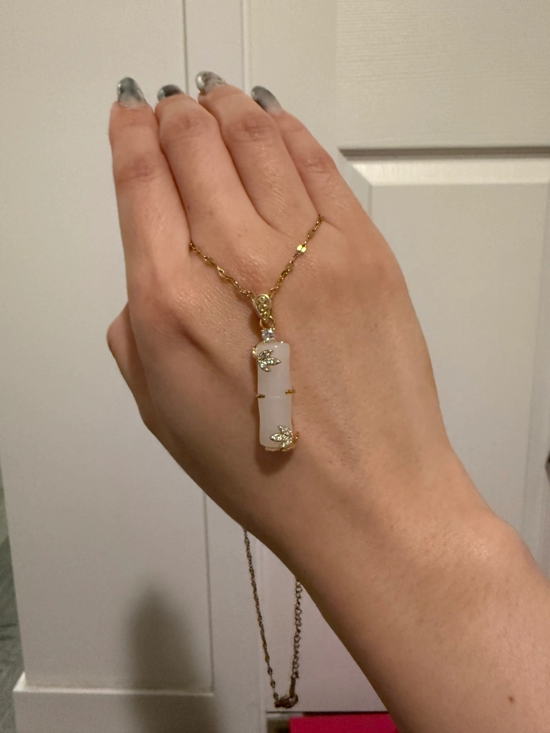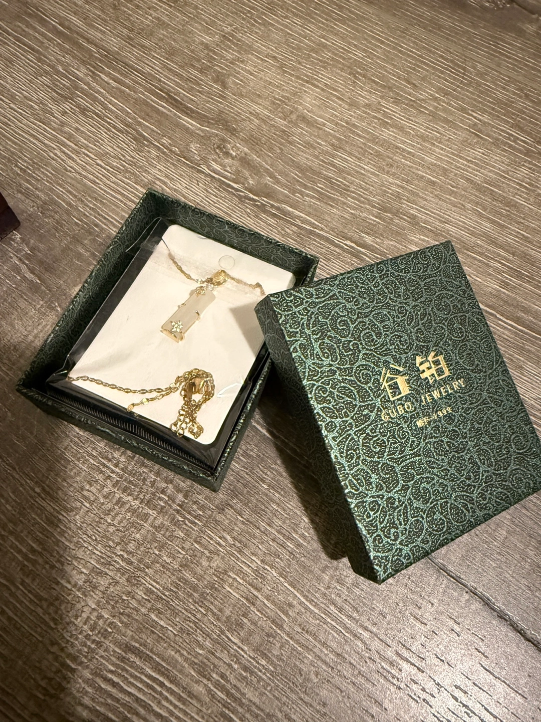 Beautiful necklace featuring a beautiful white jade (和田玉)pendant and gold chain. Comes in a green jewellery box. Perfect gift.