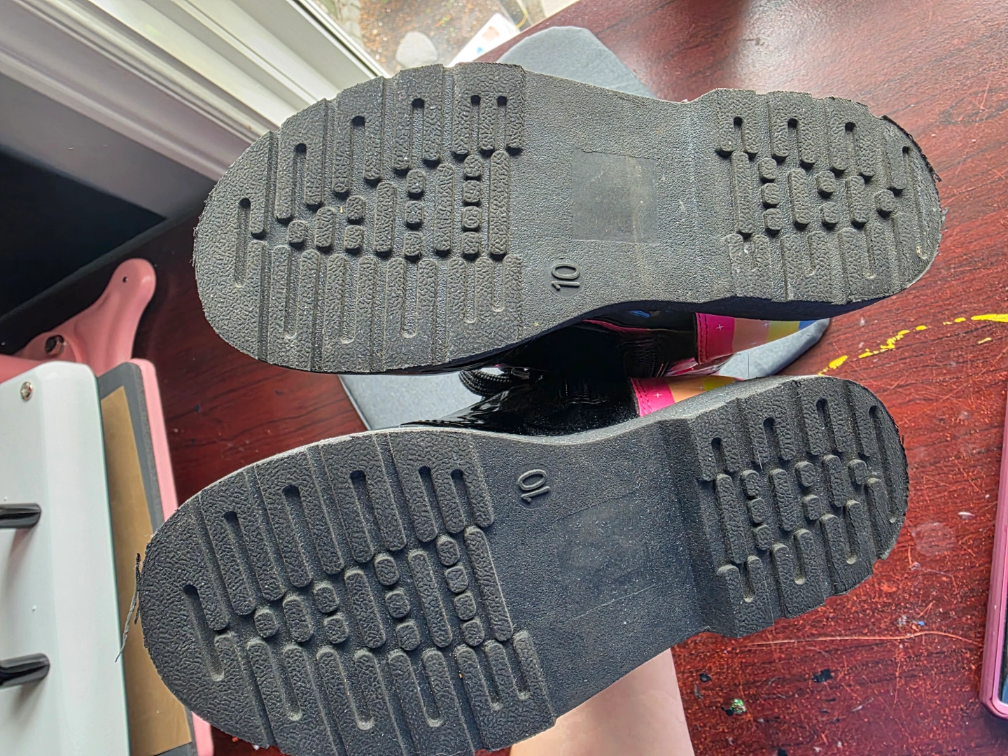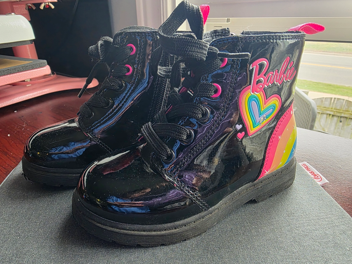 Black patent leather boots. Lace-up closure and side zipper. Rainbow and Barbie logo accents. Size 10.