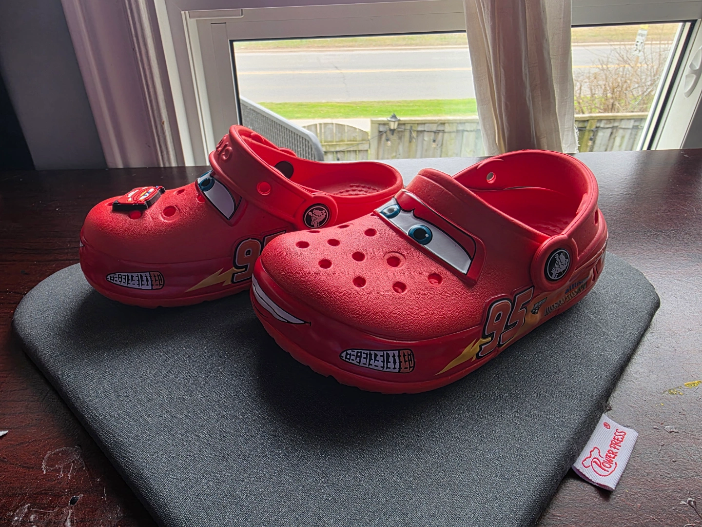 Red Cars Lightning McQueen Crocs clogs. Kids' size. Features Lightning McQueen graphics. only worn maybe twice. the front lights up