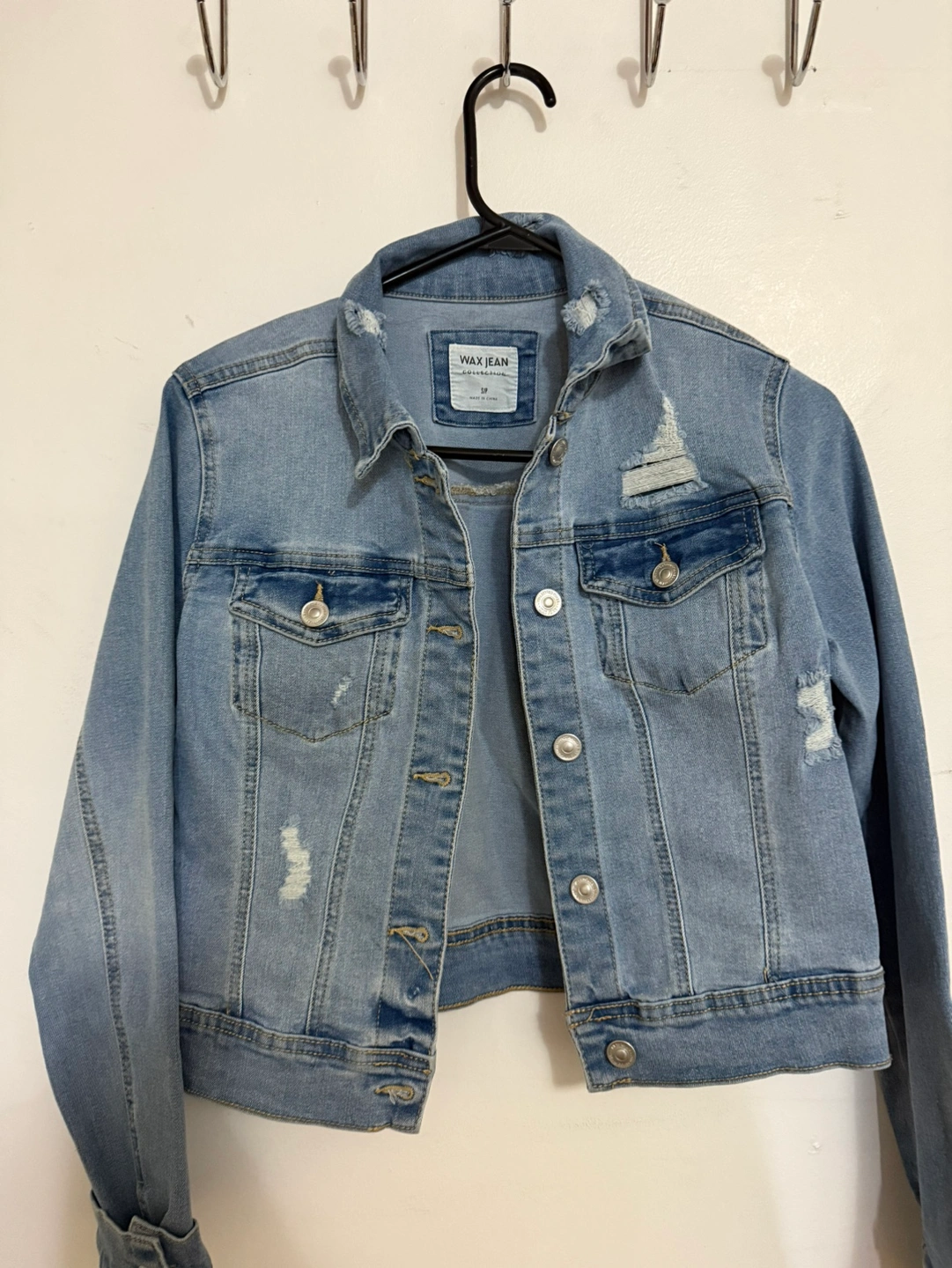763Light wash denim jacket. Features distressing and a cropped fit. Size S