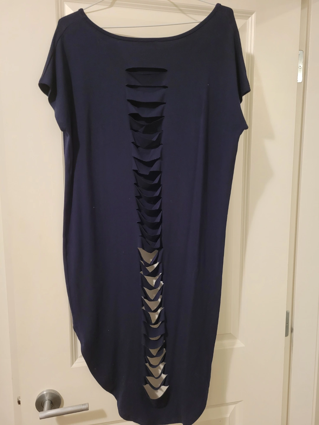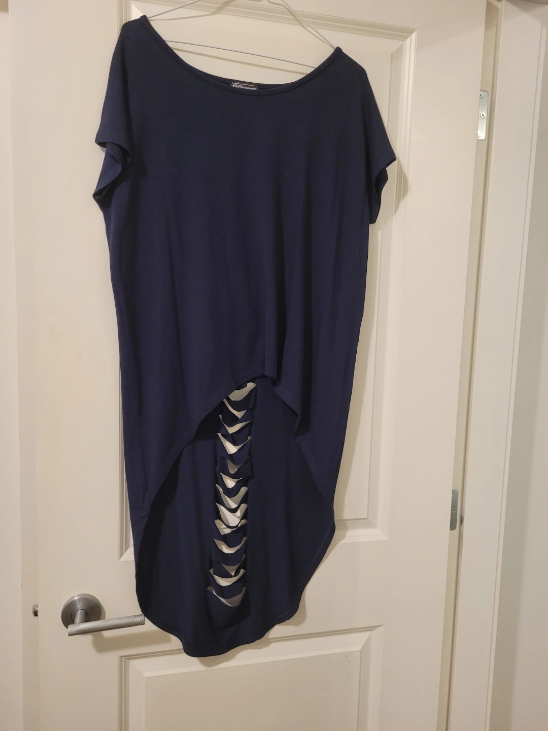 Navy blue tunic top. Short sleeves. Cut-out detailing on the back. High-low hemline. Size 40