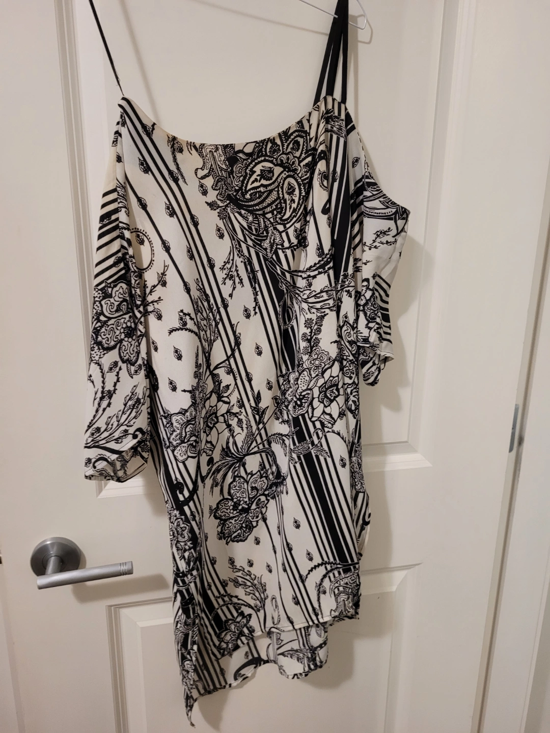 Black and white patterned top One shoulder design. Asymmetrical hemline. Lightweight material. Flowy and comfortable.