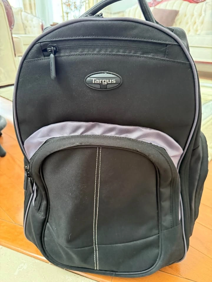 Spacious Targus backpack. Black with cool grey accents. Has lots of pockets for all your stuff. Inside has straps to keep things secure. Great for school, work, or travel.