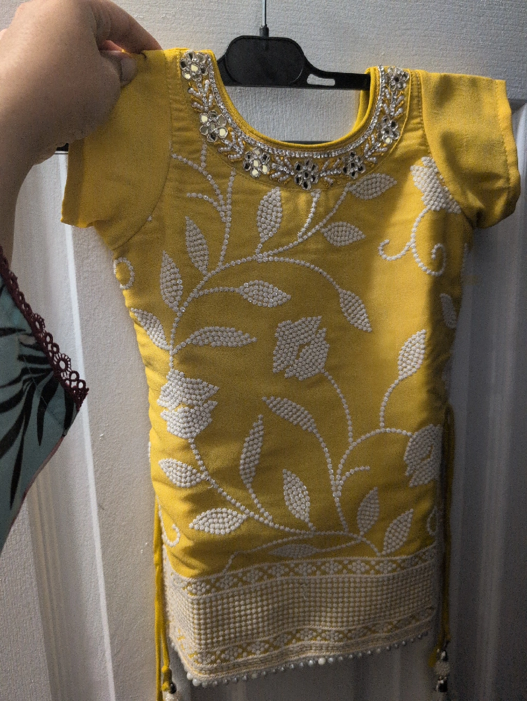 Adorable mustard yellow girls' Kurti set. Features intricate beading and embroidery. Includes a matching bottom and dupatta. Perfect for special occasions. Size is 18.