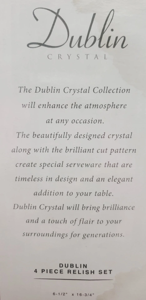 New in box. Elegant crystal relish set. Includes three small bowls and a serving tray. Timeless design. Perfect for entertaining. Delivery is available on little bit of gas money.