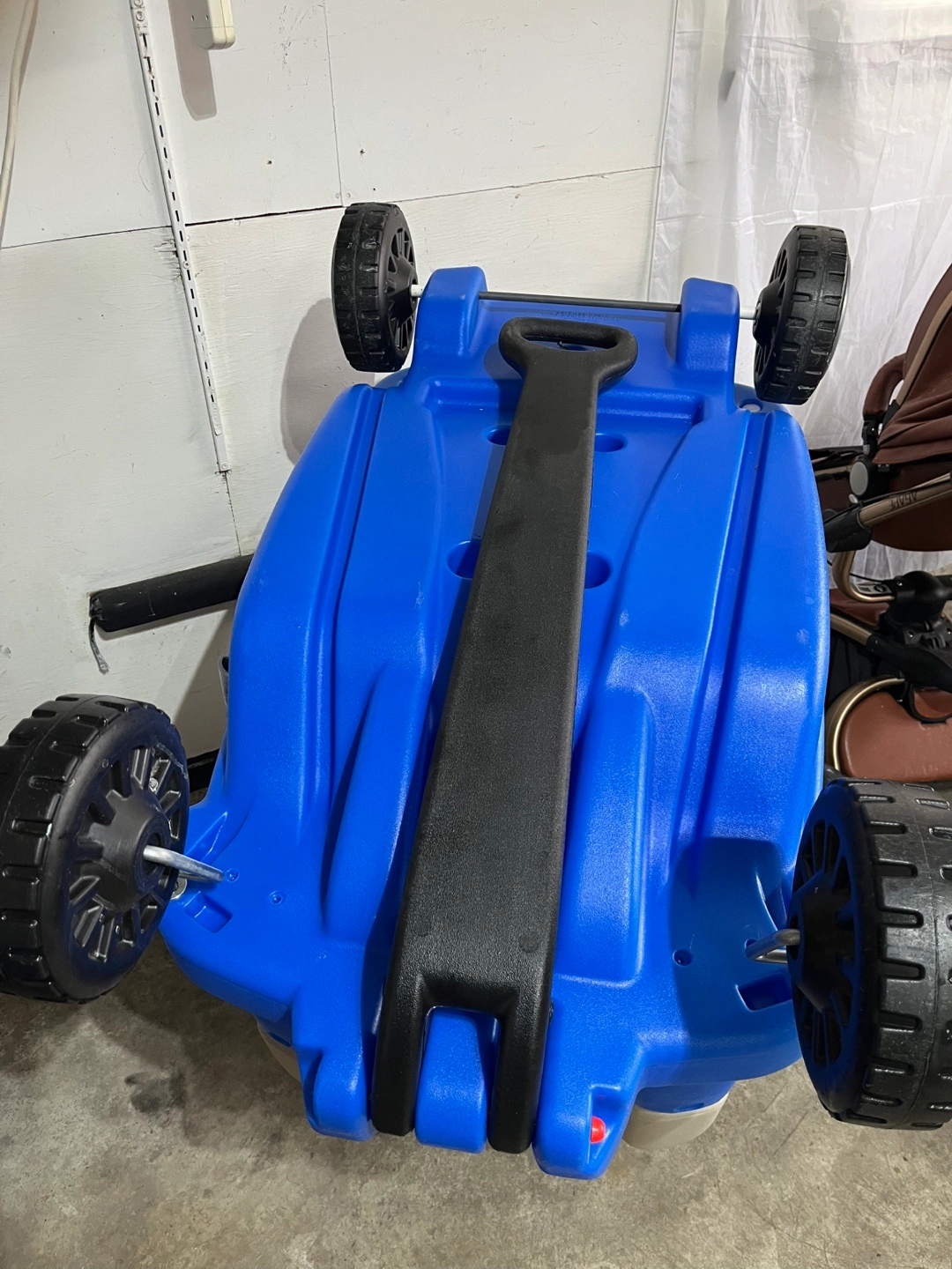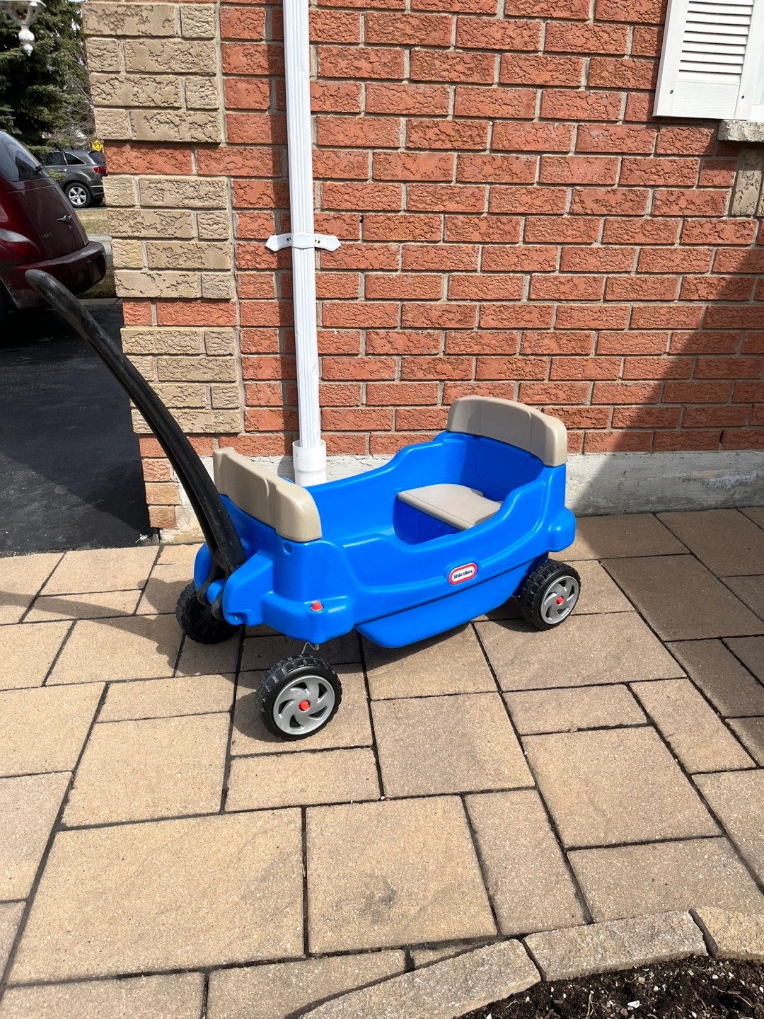 Blue plastic wagon. Features a pull handle and beige accents. Durable construction. Suitable for children.