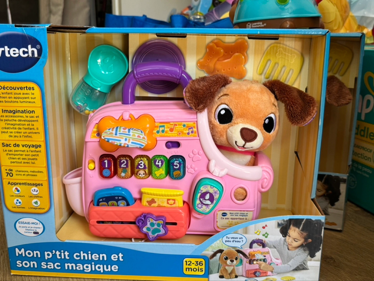 - Jam-packed puppy carrier includes buttons that introduce colors, numbers, shapes and pet phrases to help boost language skills