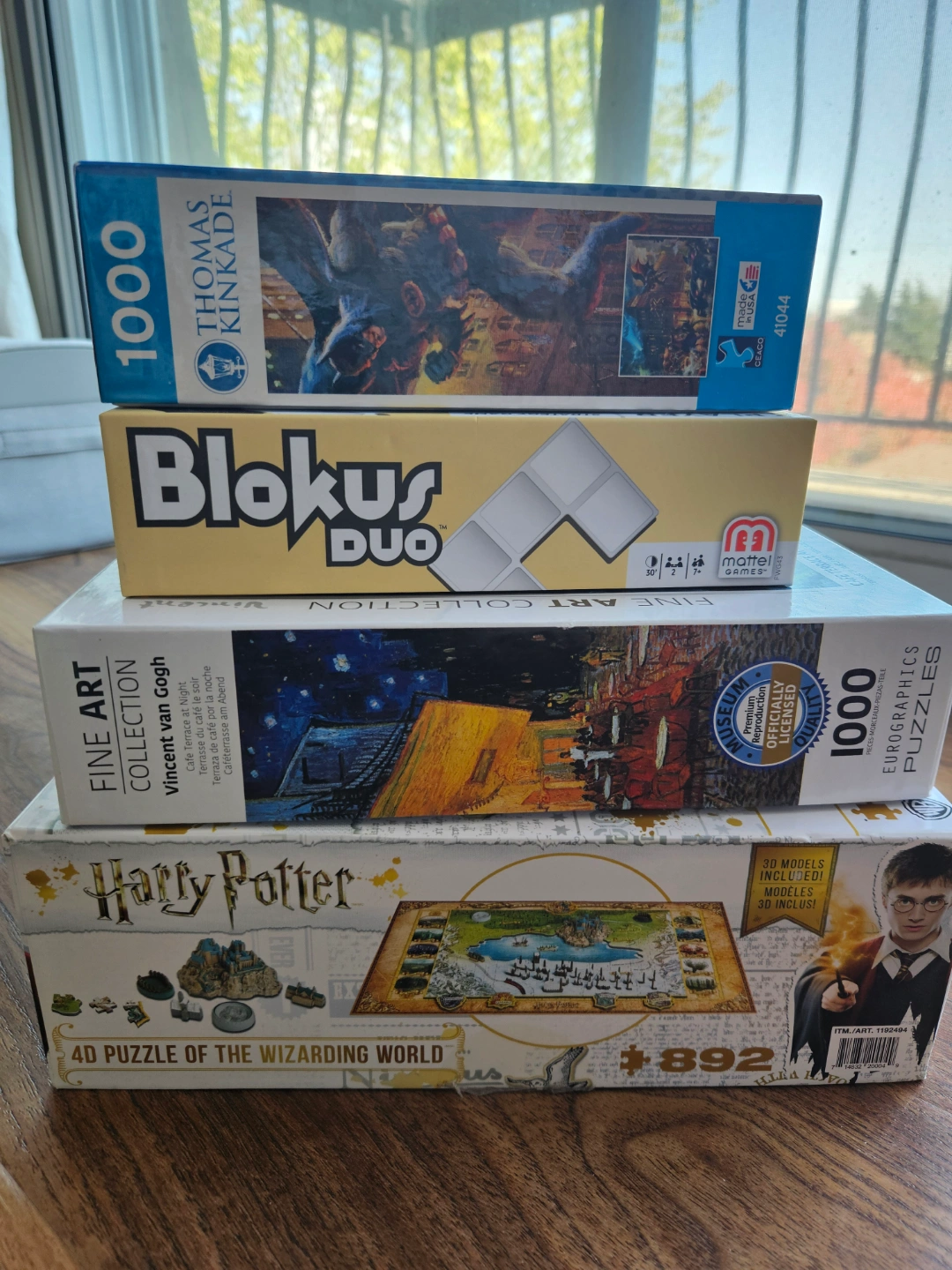 23A few puzzles and games I'm no longer using. $10 each or take the lot for $25. Everything has all pieces. 1. Thomas Kinkade DC 1000 piece puzzle (has all pieces, used once) 2. Blokus Duo (has all parts, used once) 3. Vincent Van Gogh 1000 piece puzzle by Eurographics Puzzles (has all pieces, used once) 4. Harry Potter The Wizarding World 4D 892 piece puzzle (has not been used and the bags inside are still sealed)
