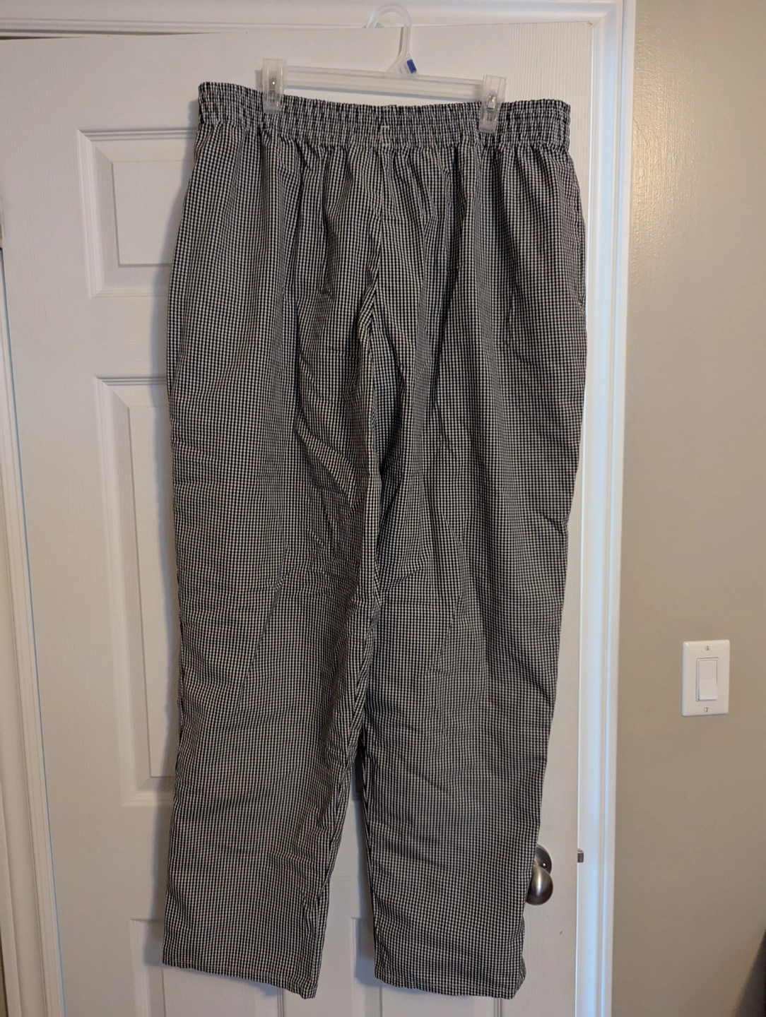 Plus size chef pants. Elastic waist. Black and white gingham pattern. Cropped length.