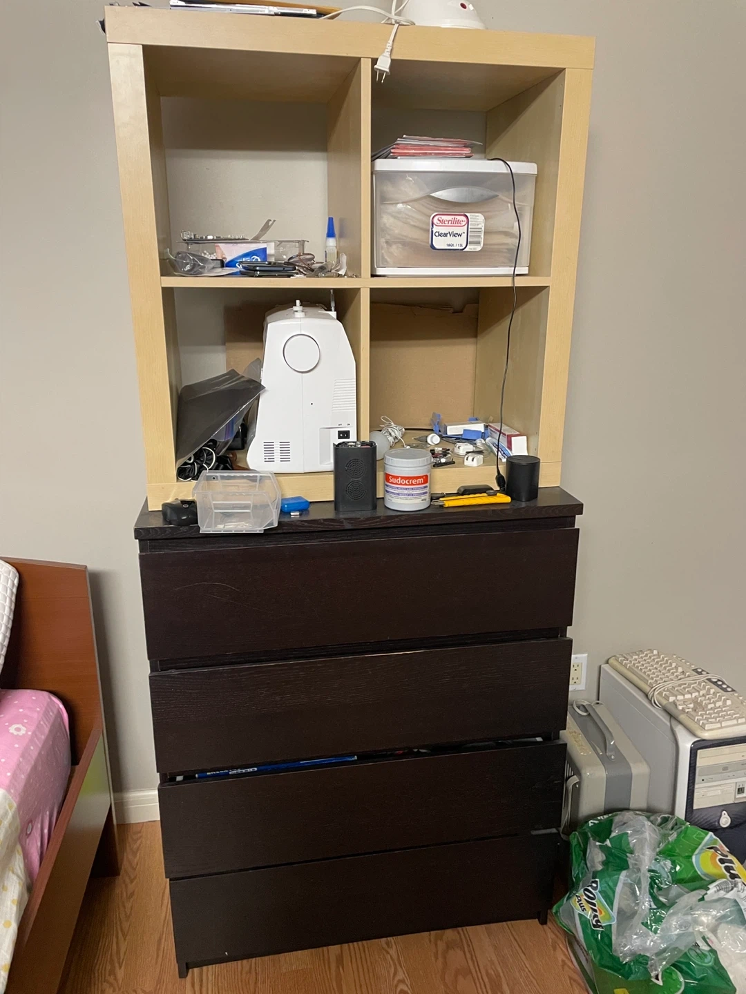 This is a dark brown, 4-drawer dresser. It's made of particleboard with a laminate finish. Some minor scuffs are visible on the top drawer fronts.