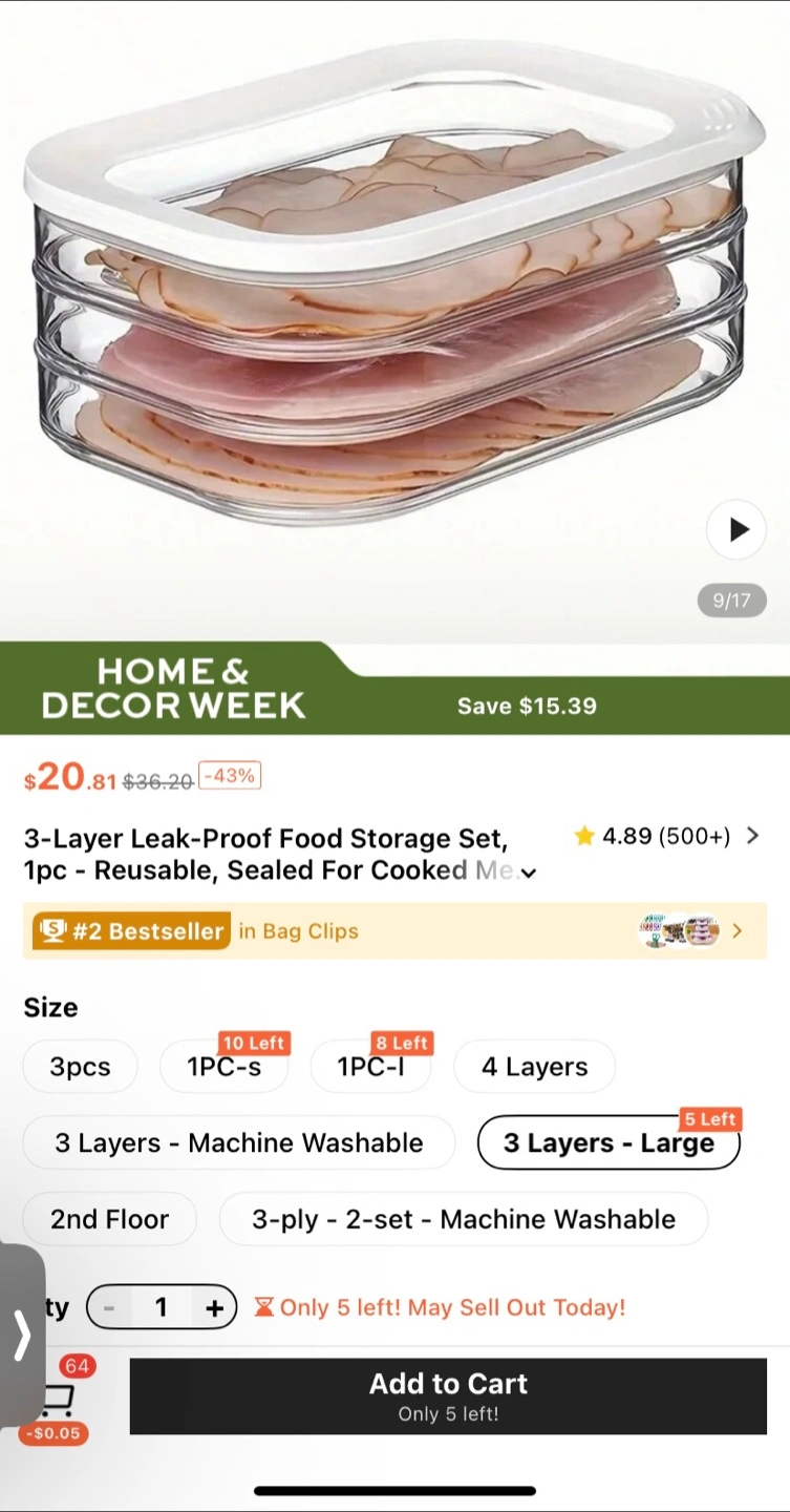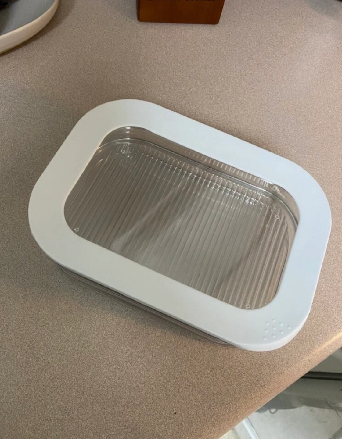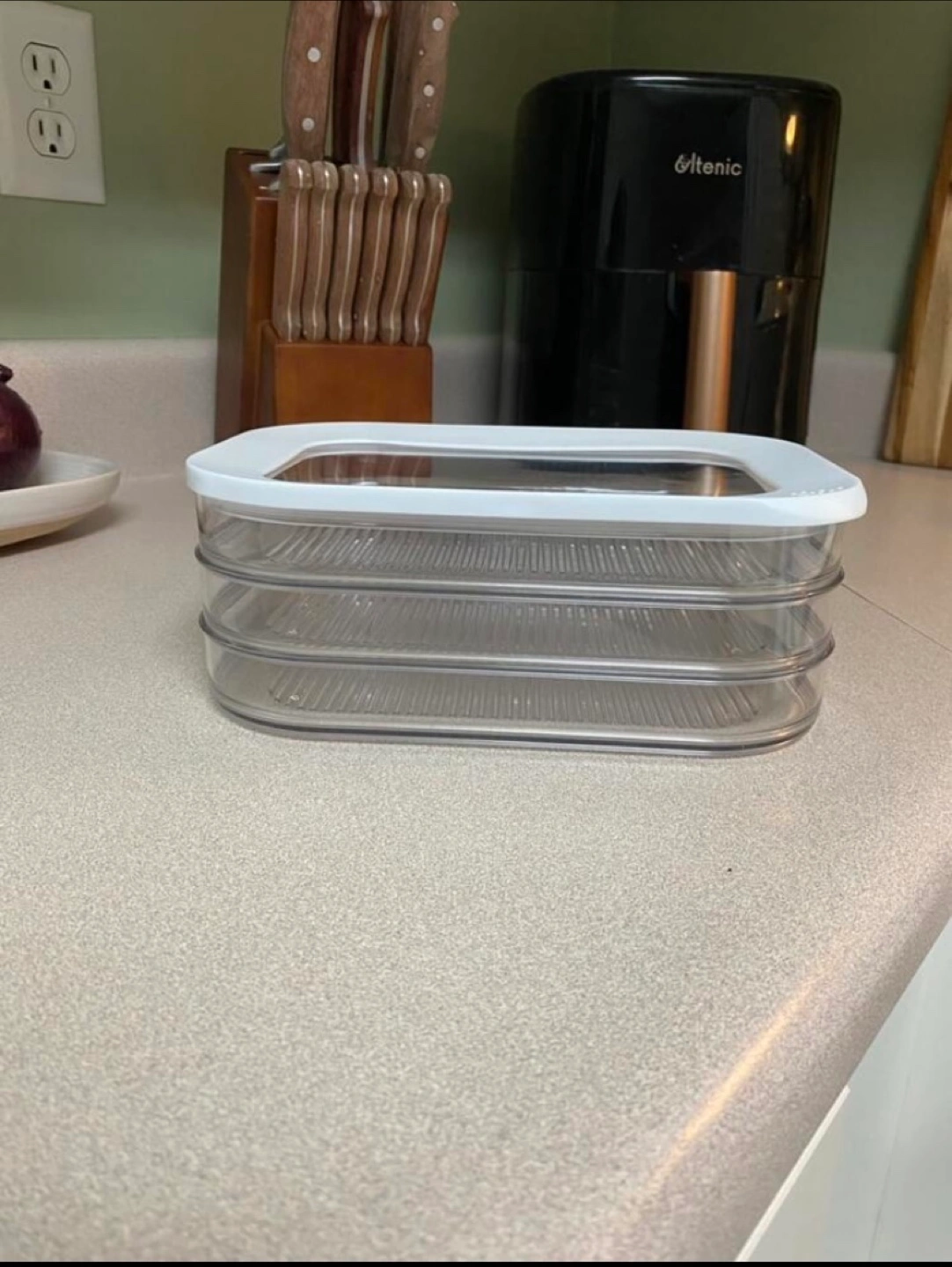 A food storage container with a transparent body and a white lid. The container appears to be stacked, layered with multiple compartments. Keep your food fresh and organized with this food storage set, a great way to reduce food waste.