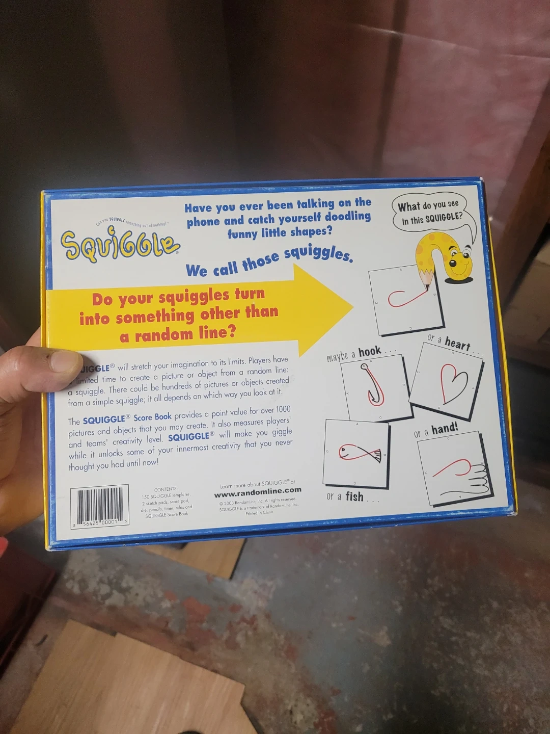 Squiggle will stretch your imagination to its limits! Players have limited time to stretch a picture or object from a random line, a squiggle. There could be hundreds of pictures or objects created from a simple squiggle; it all depends on what you see and look at it. The Squiggle Score Book provides a point value for over 1000 pictures and objects that players create. It also measures players' and teams' proficiency level. Squiggle will make you giggle while it unlocks some of your innermost creativity that you never thought you had until now! For ages 6 to adult or more players