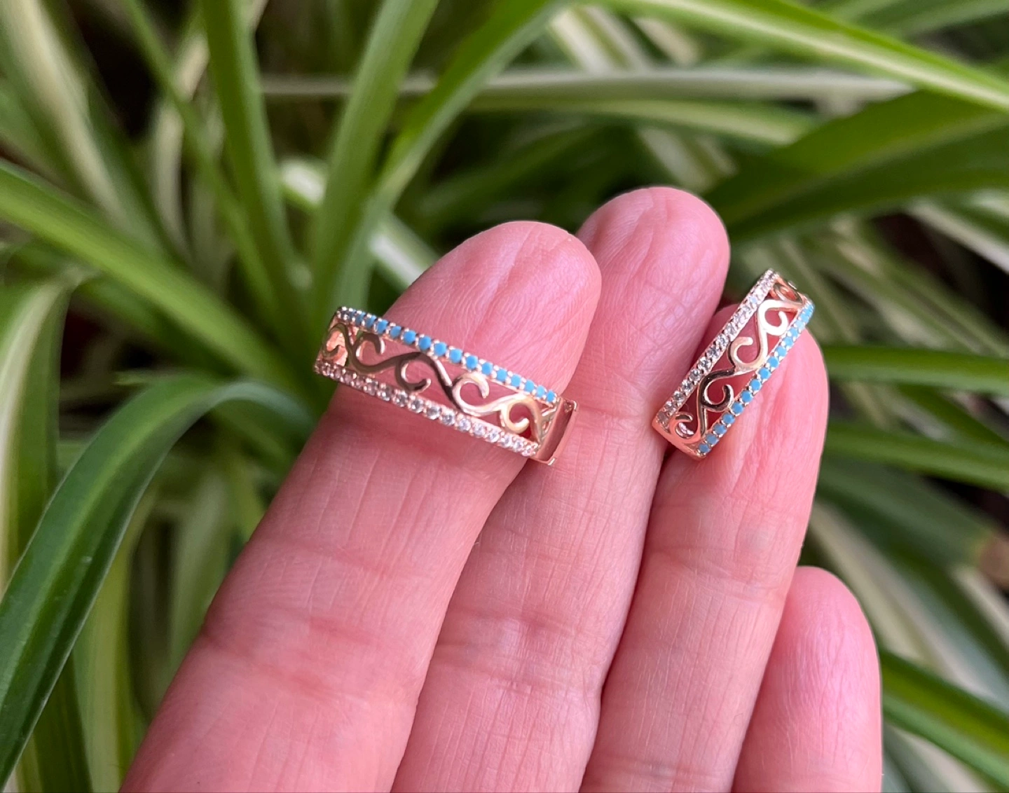 Pair of gold plated hoop earrings. Features turquoise and clear zircons .Delicate design. Approximately 2 cm in diameter.