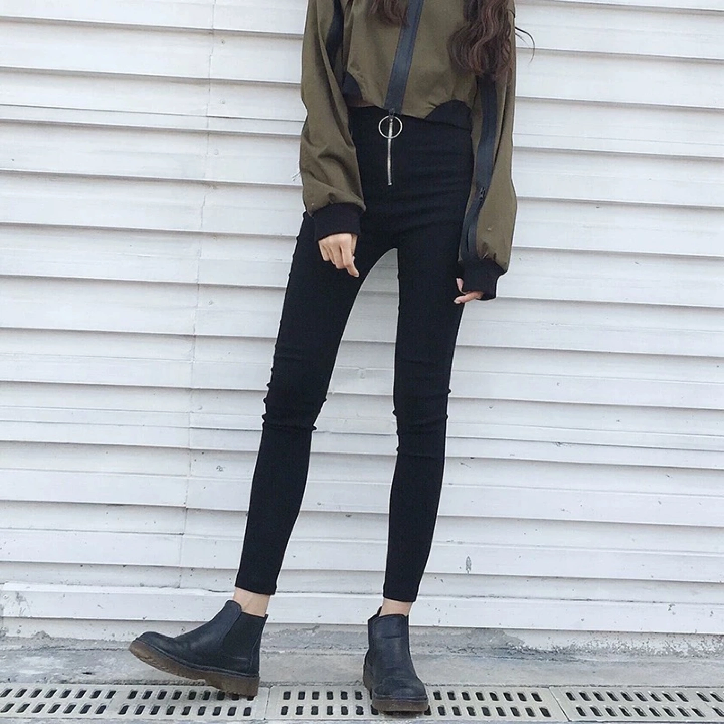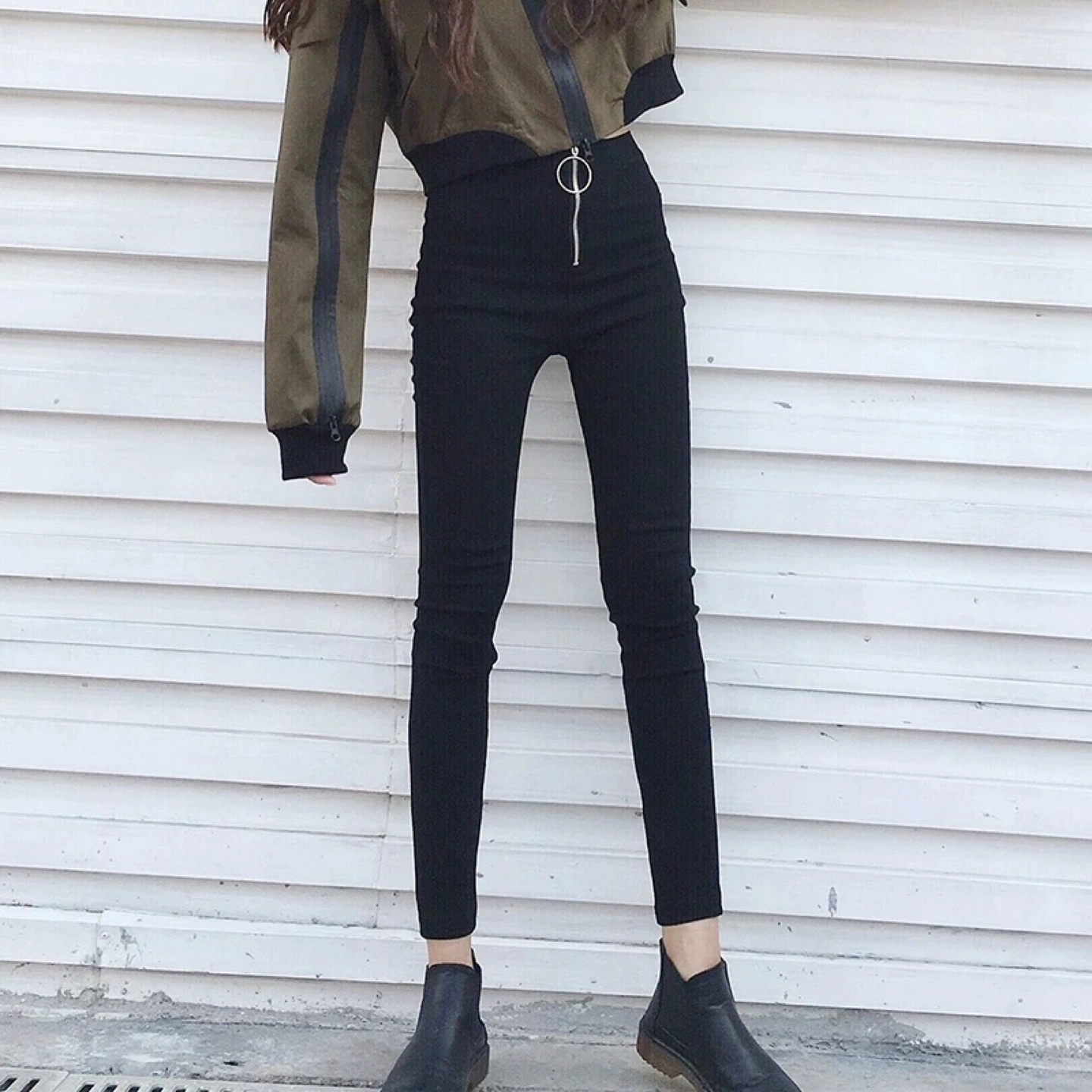 42Stylish black high-waisted pants. Features a front zipper and a unique ring pull. Great for a variety of outfits.