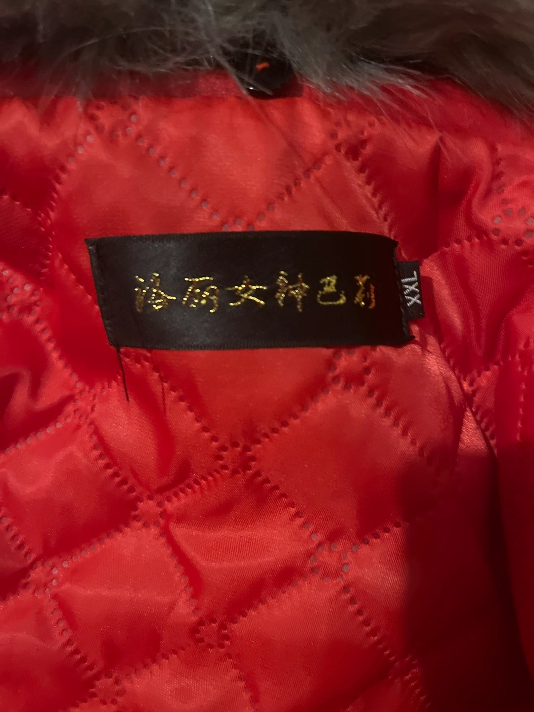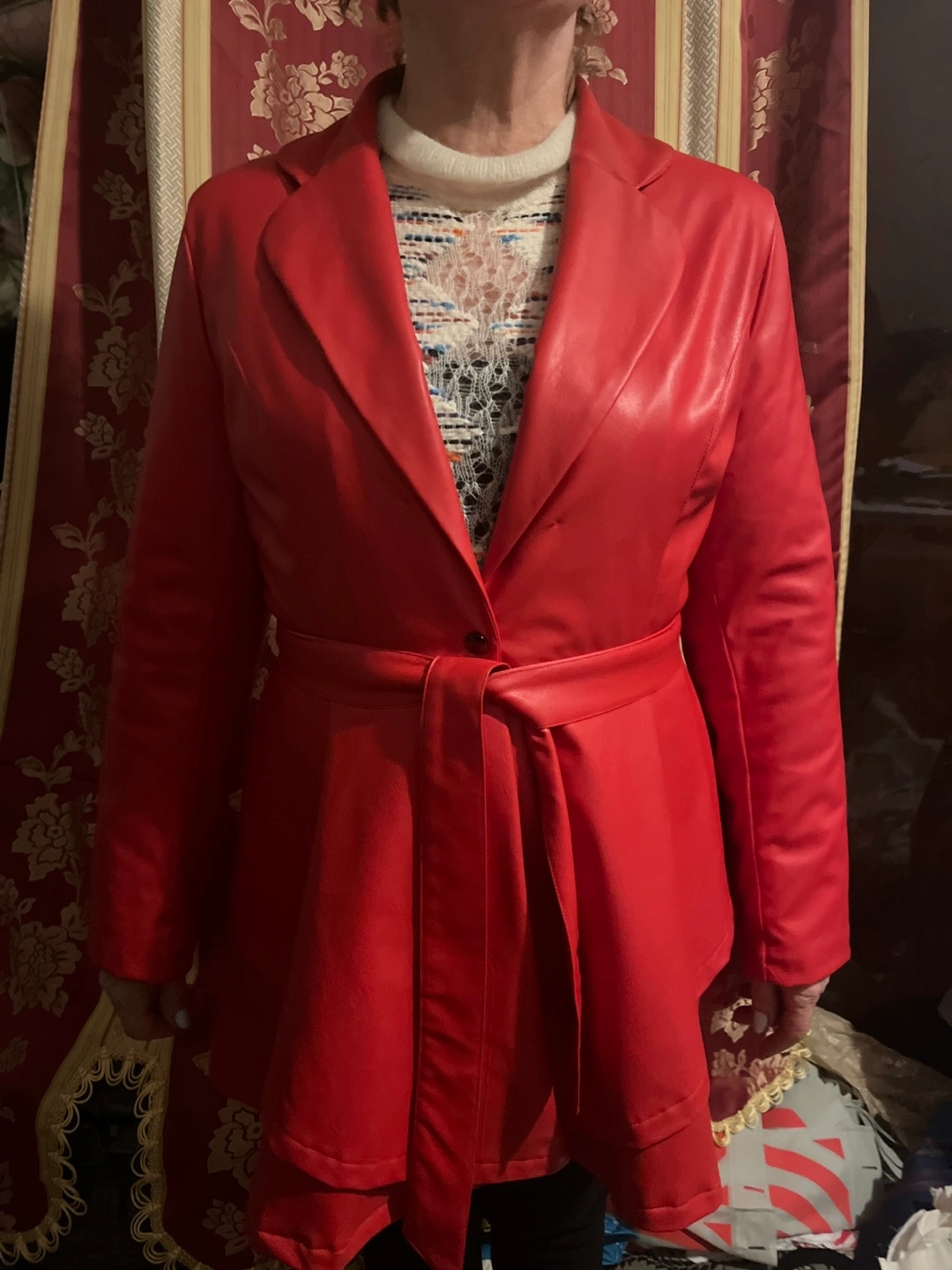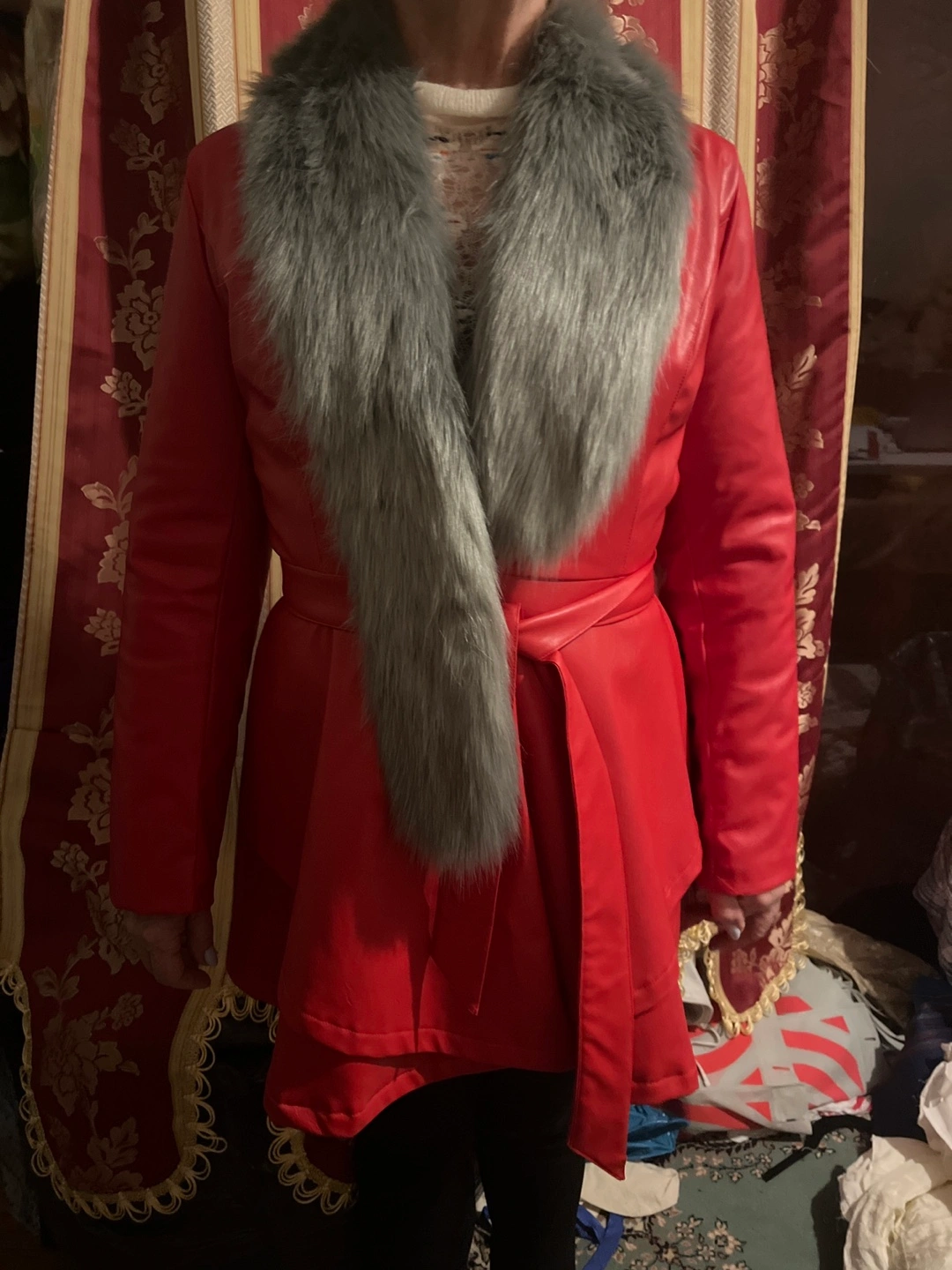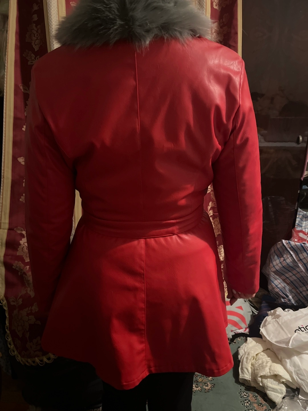 Women's red faux leather jacket. Features a gray faux fur collar and a belted waist. Long sleeves. Asymmetrical hemline.