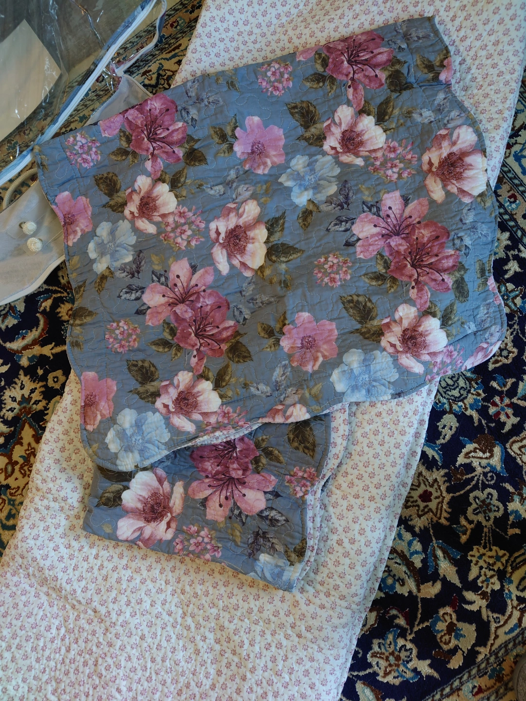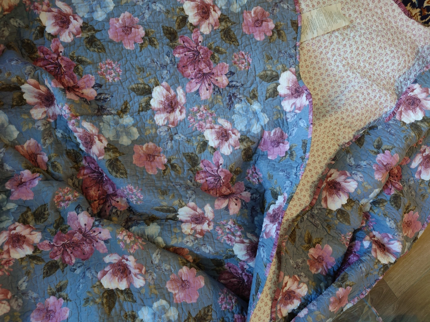 Beautiful floral quilted bedspread set. Features a lovely blue and pink floral pattern. Includes a bedspread and two pillow shams. Soft and comfortable.