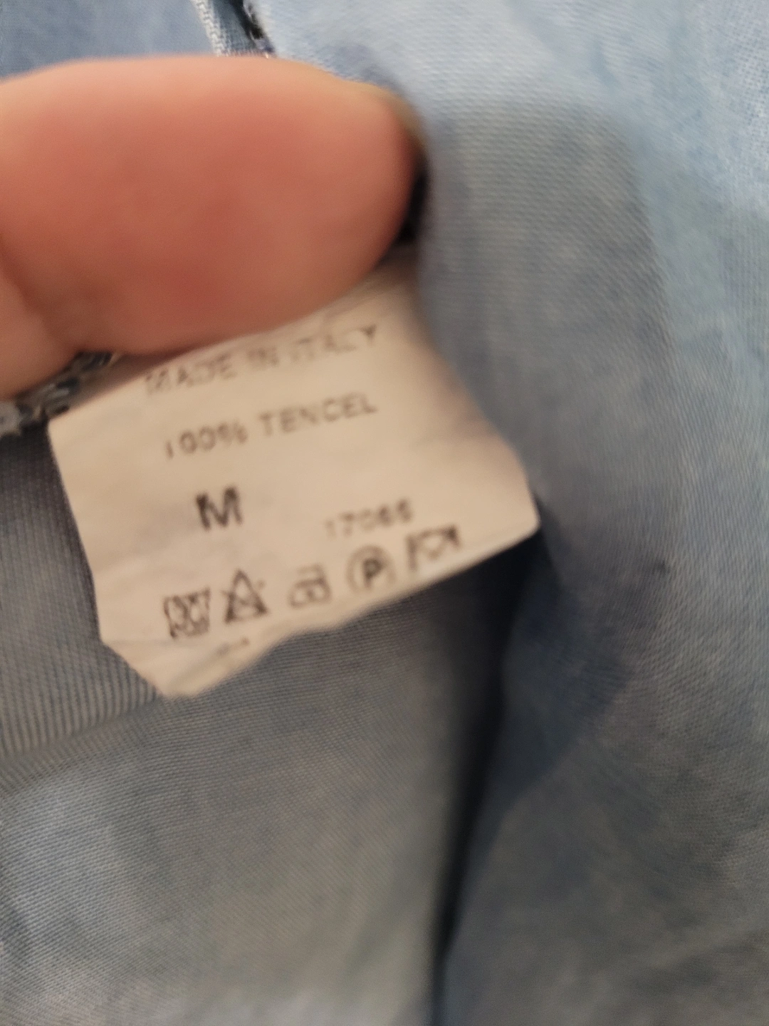 Light blue denim shirt dress. Cold shoulder detail. Long sleeves with tie detail. Button-down front. Made in Italy. 100% Tencel.