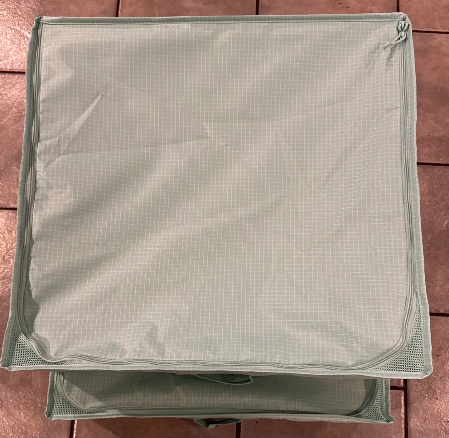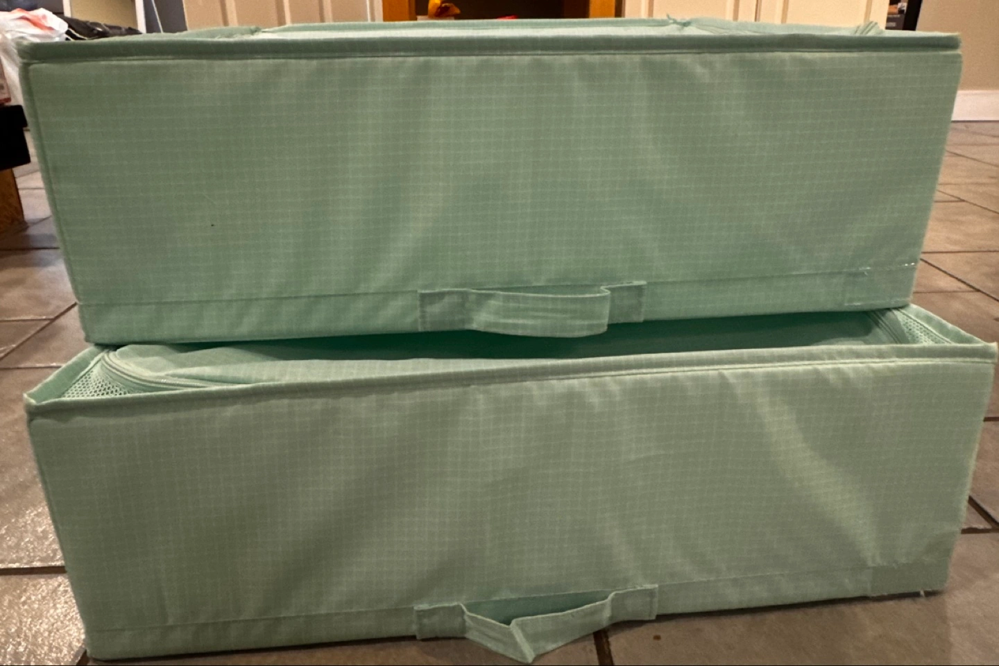 171Two mint green fabric storage bins. Collapsible design. Features zipper closures and handles. IPlace this case in a wardrobe or slide it under the bed – great for storing seasonal clothes or bedding while protecting them from dust. Pick up at Riverbend SE. Cash only