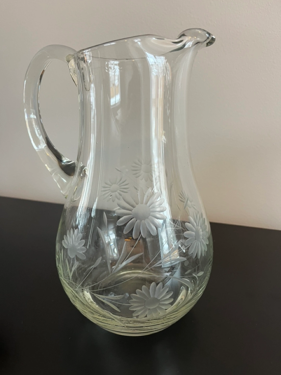 Elegant glass pitcher. Features an etched daisy floral pattern. Clear glass. Perfect for serving beverages.