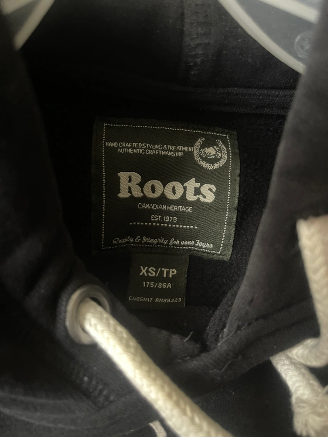 Black Roots hoodie. Features a Roots Athletic Goods logo. Size XS/TP. But it fits bigger. Drawstring hood. Front pouch pocket.