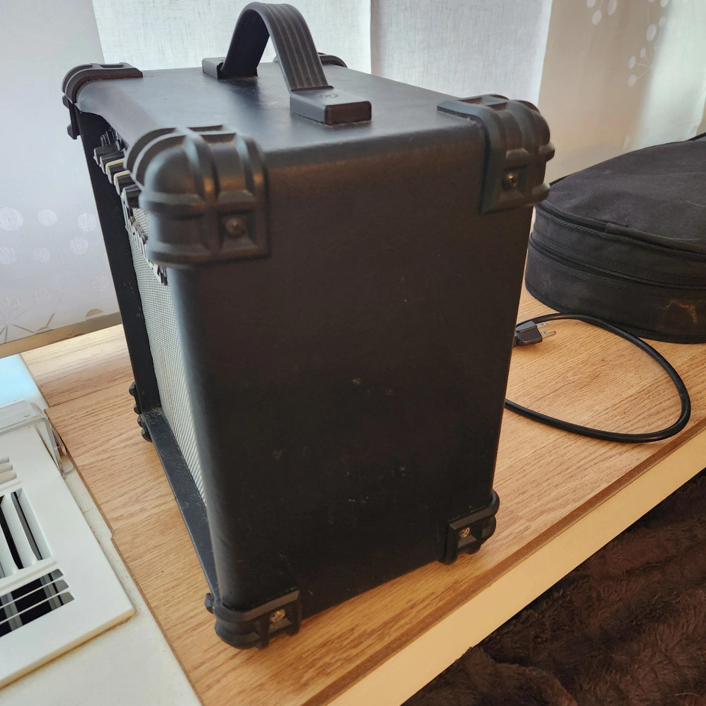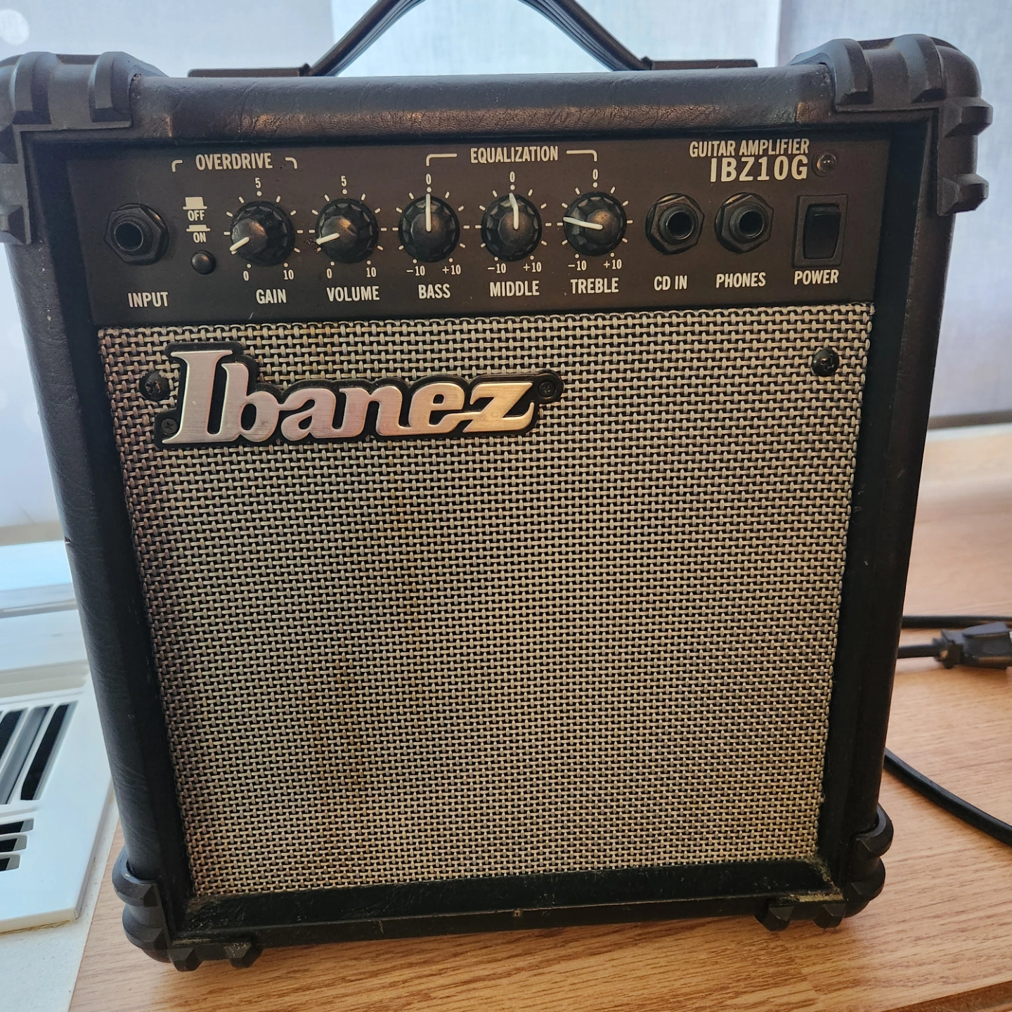 Small guitar amplifier. Includes power cord. Model IBZ10G. Features overdrive, equalization controls, headphone jack, and CD input. Good for practice small get togethers and jamming or mic it for performances.. . great sound can be pretty loud.