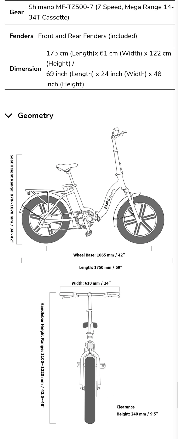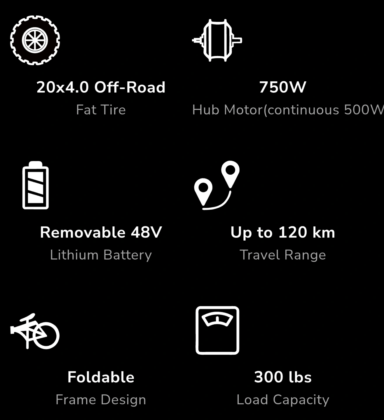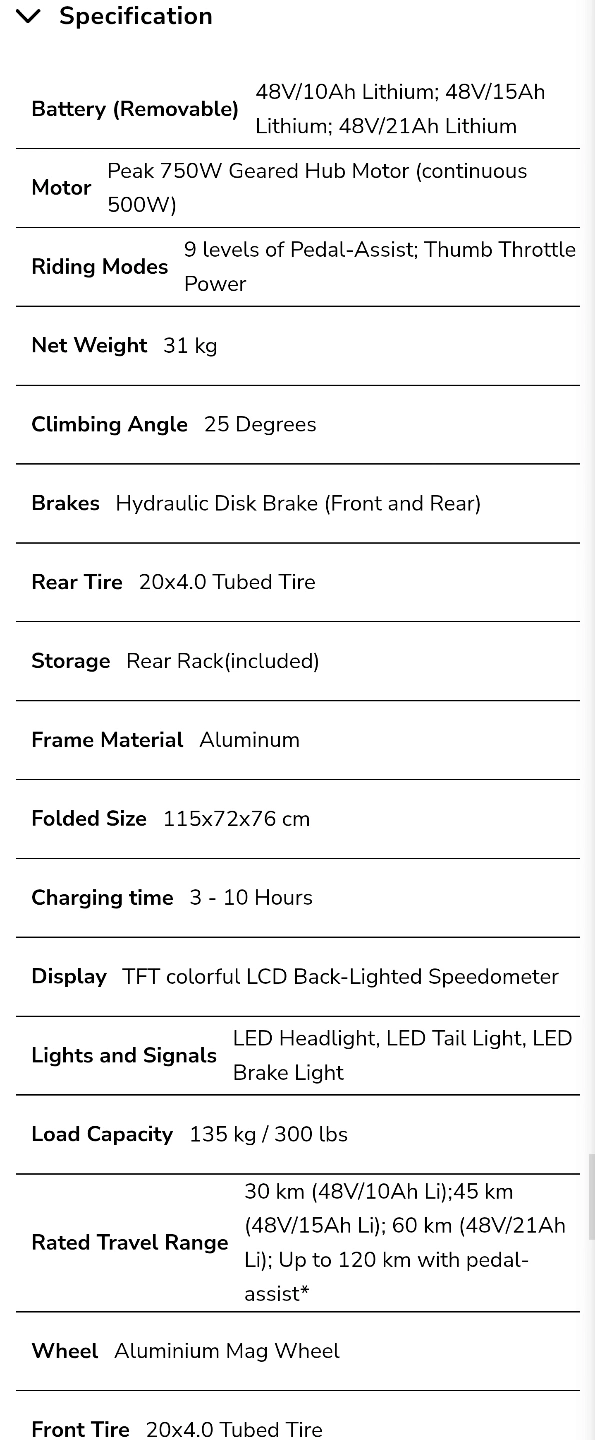 It's a foldable e-bike with fat tires π. Features a 750W geared hub motor, 48V/10Ah removable lithium batteryπ€€, and up to 120 km range. Includes cadence sensor and XOD hydraulic disk brakes. Maximum load capacity 300 lbs. Black. Come with charger.