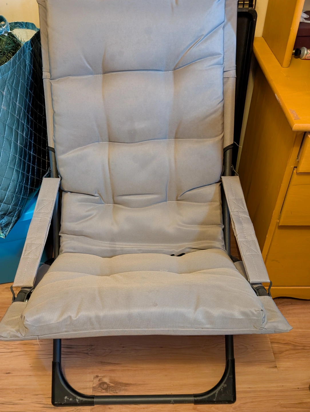 Comfortable padded outdoor patio chair. Grey fabric. Folds for easy storage. Black metal frame. excellent condition