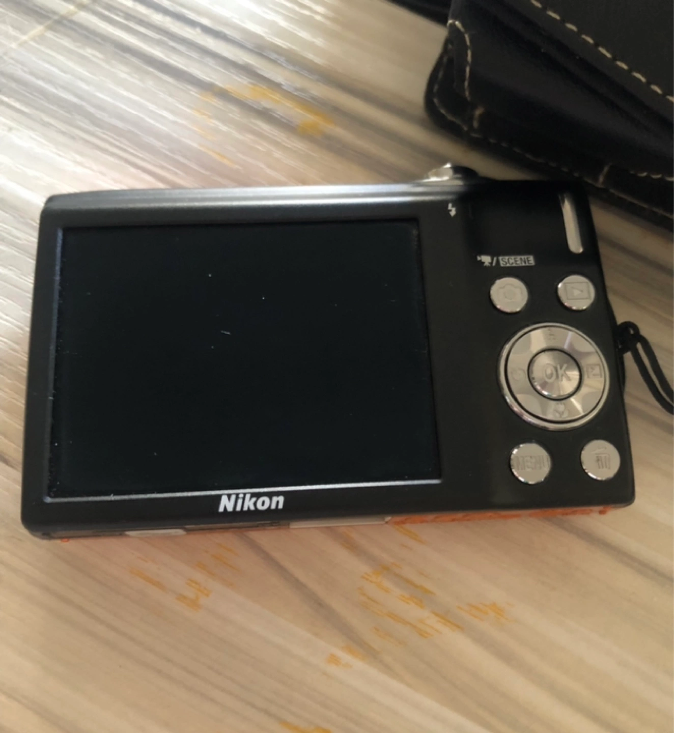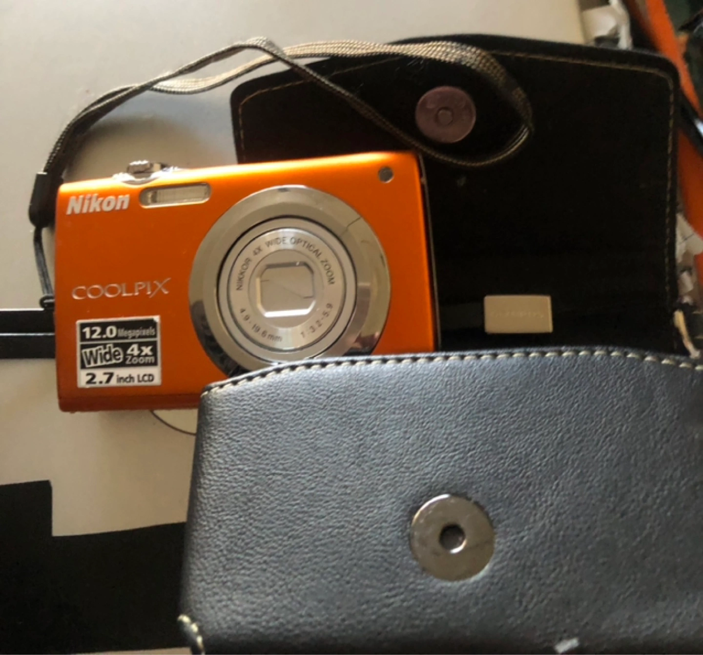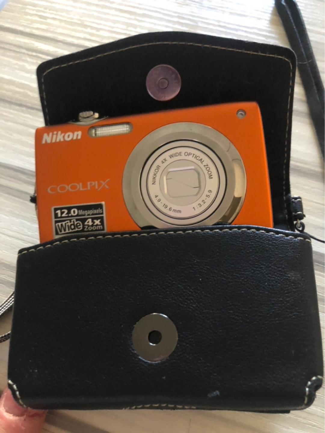 Orange Nikon Coolpix digital camera. 12.0 Megapixels, 4x Wide Zoom, 2.7 inch LCD. Includes a black leather carrying case.