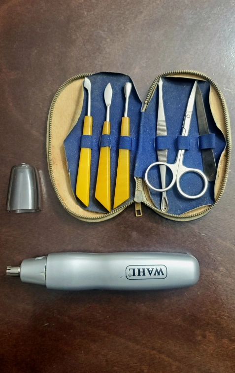 Vintage manicure set in a leatherette case. Includes various tools. Also includes a Wahl nose and ear hair trimmer. Delivery is available on little bit of gas money.
