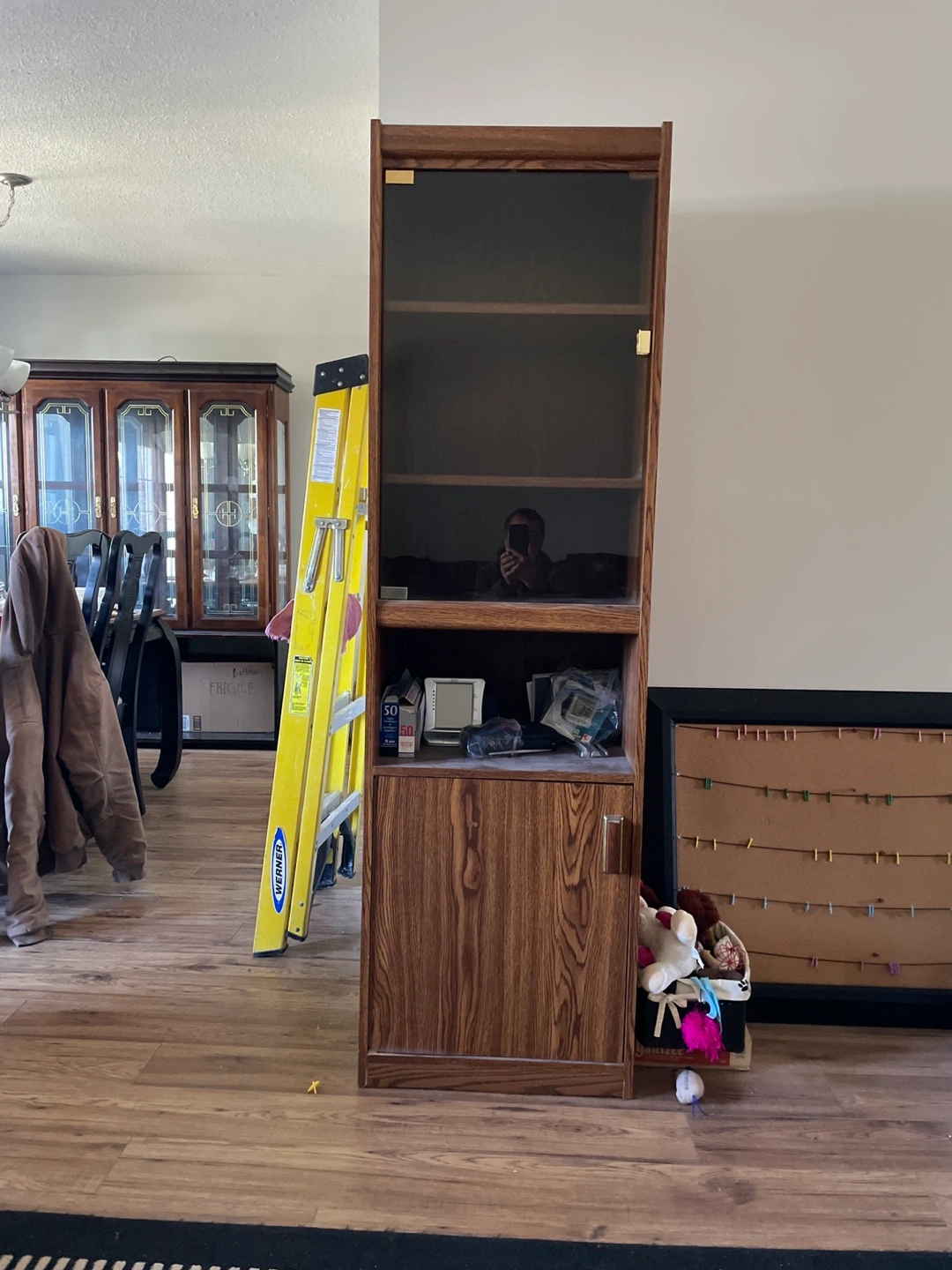Dark brown wooden cabinet. Features a glass-paned upper section with a shelf and a solid wood lower cabinet with a door. Good for storage.