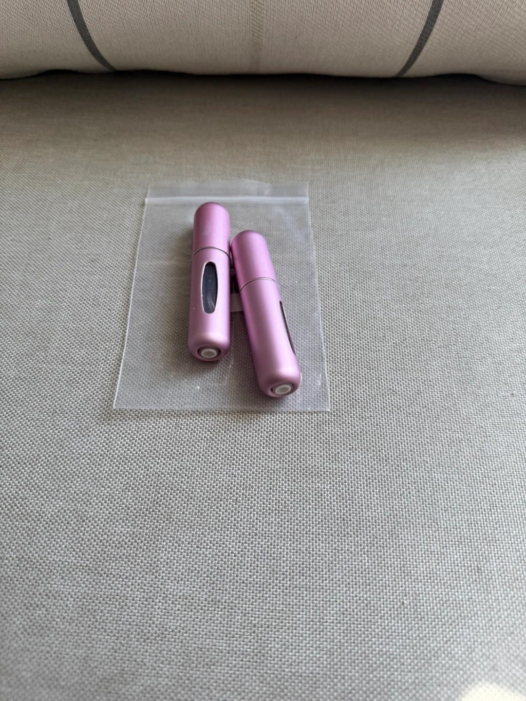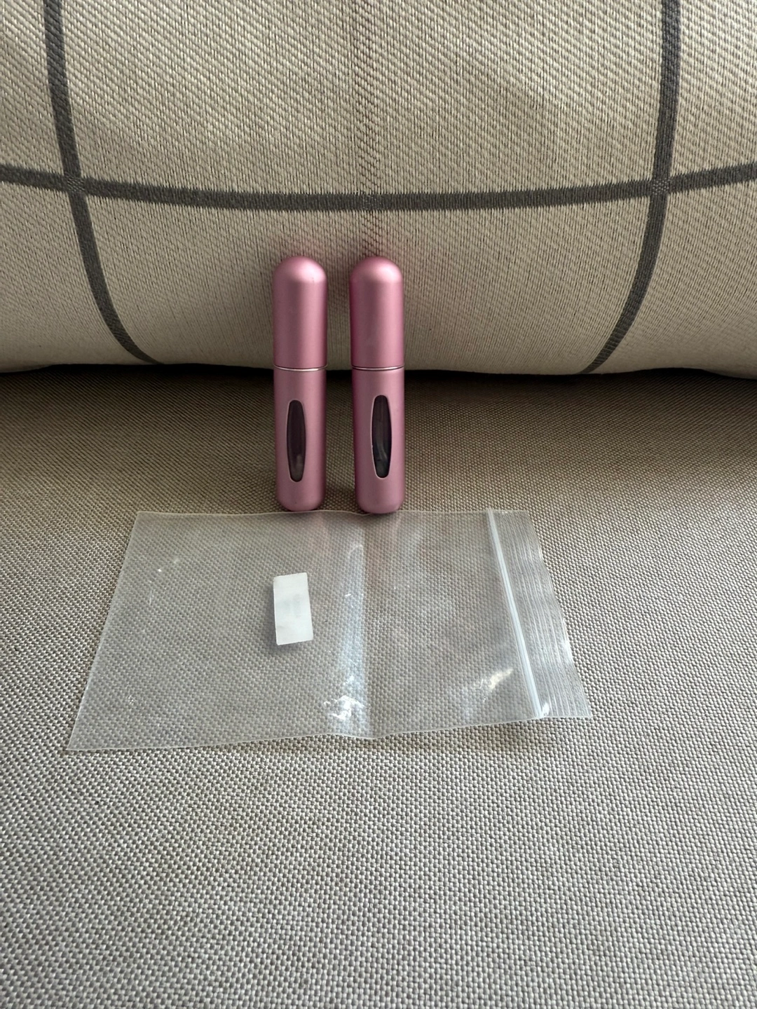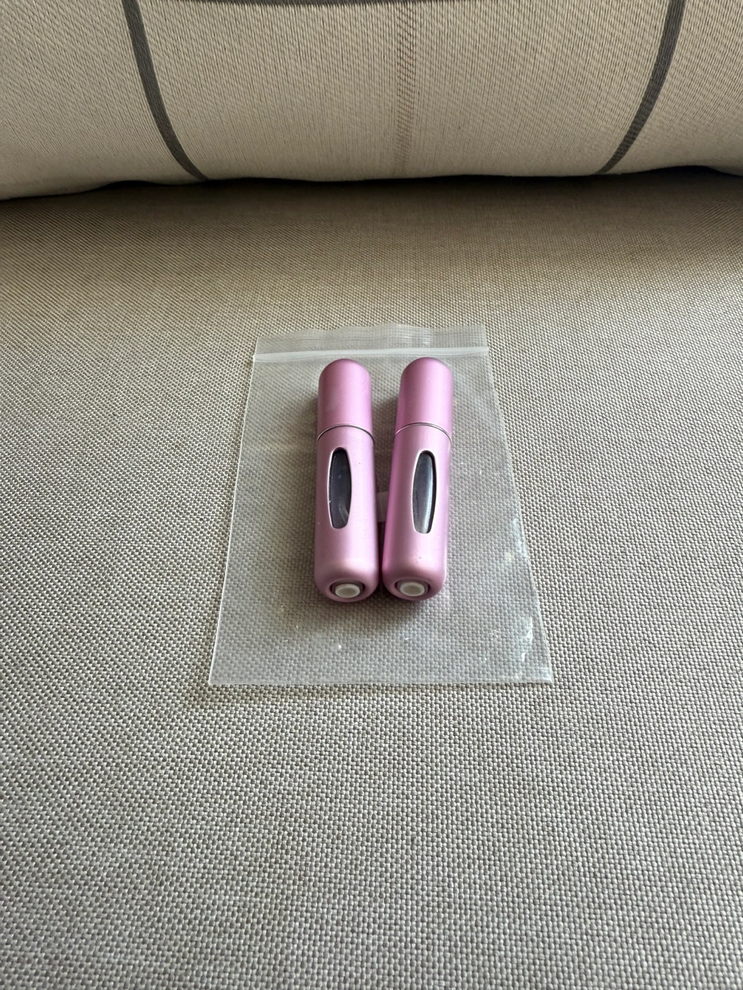 692Two cute pink refillable atomizers. Perfect for travel. Metal casing. Small and portable.