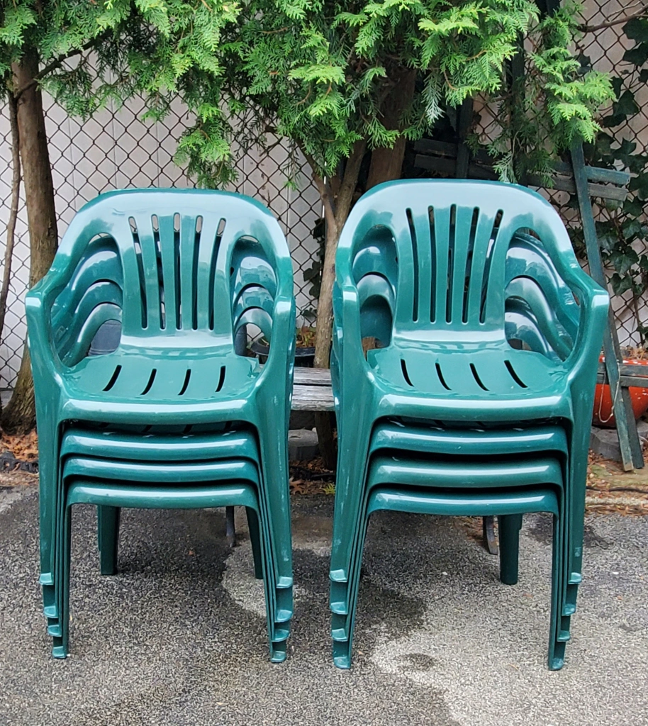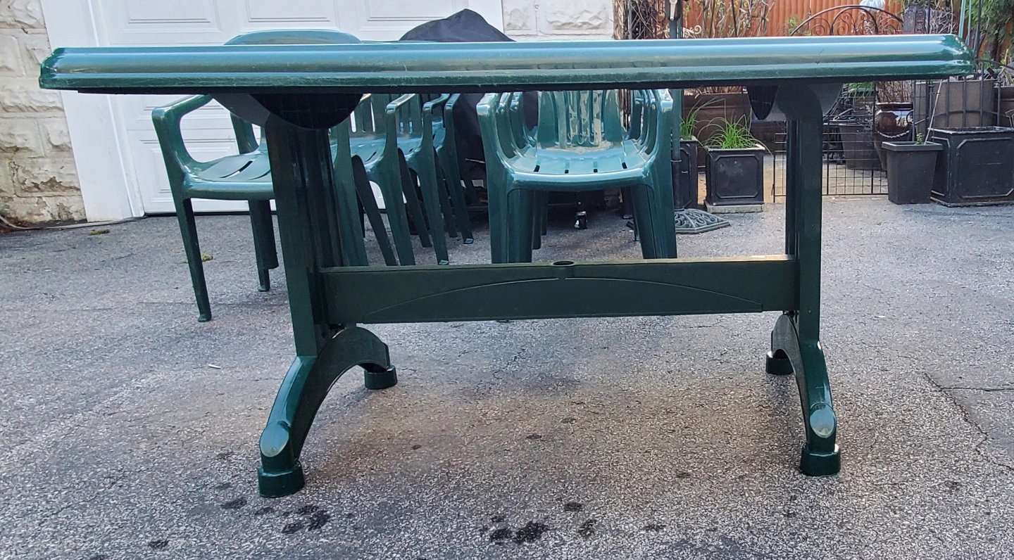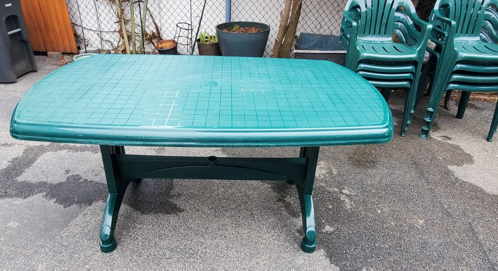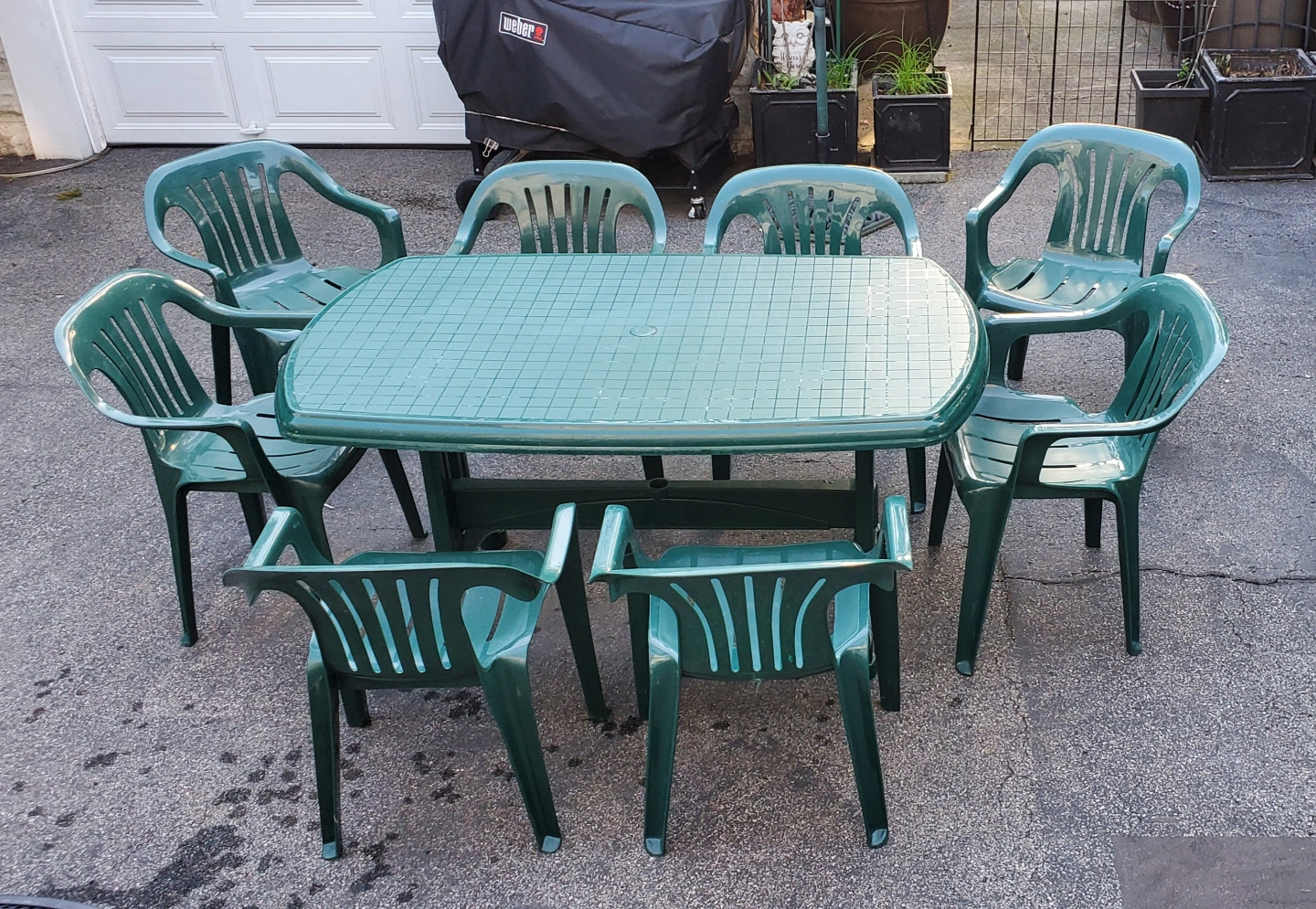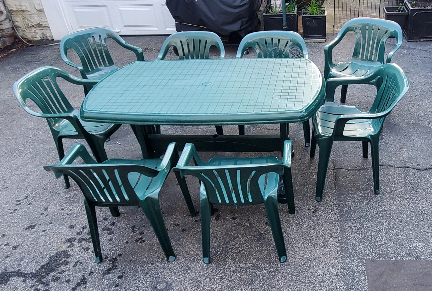 Green resin dining set, table and 6 chairs set plus 2 extra chairs. Table measures 60" long x 34-35" wide and has openingin the center for an umbrella . Bottom base of table comes apart and folds flat for easy transport and storage. Chairs are stackable. Minor scratches from being stored in my garage but other than that looks great!.