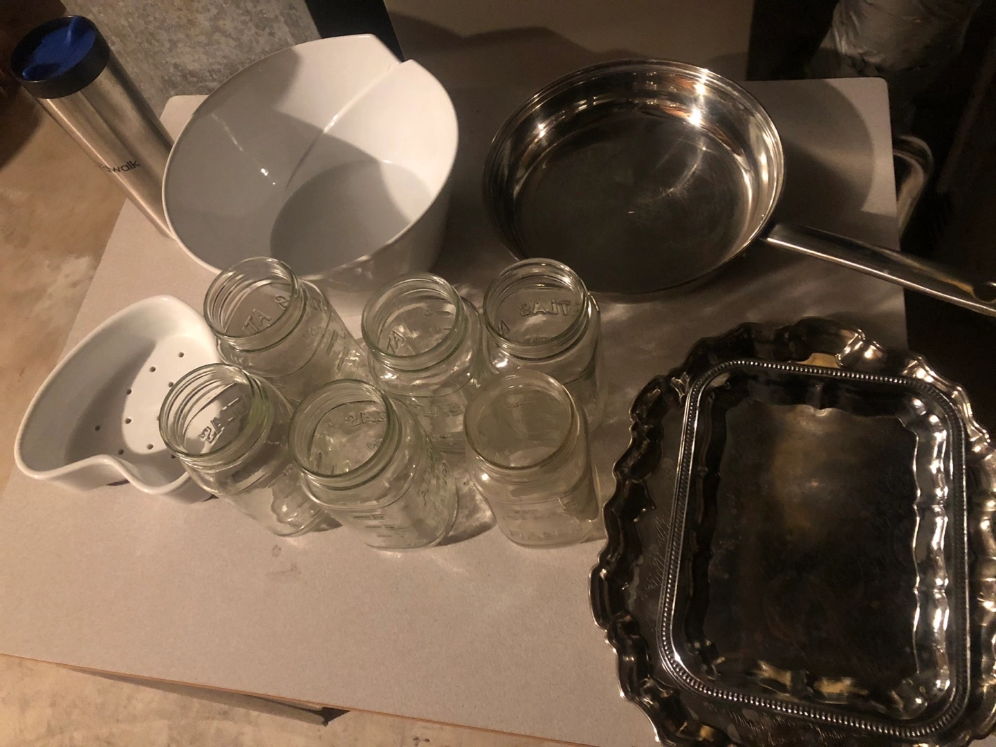 Various kitchen items. Includes a white mixing bowl, several glass canning jars, a stainless steel frying pan, a small white colander, and a silver serving tray. Great for canning or general kitchen use.