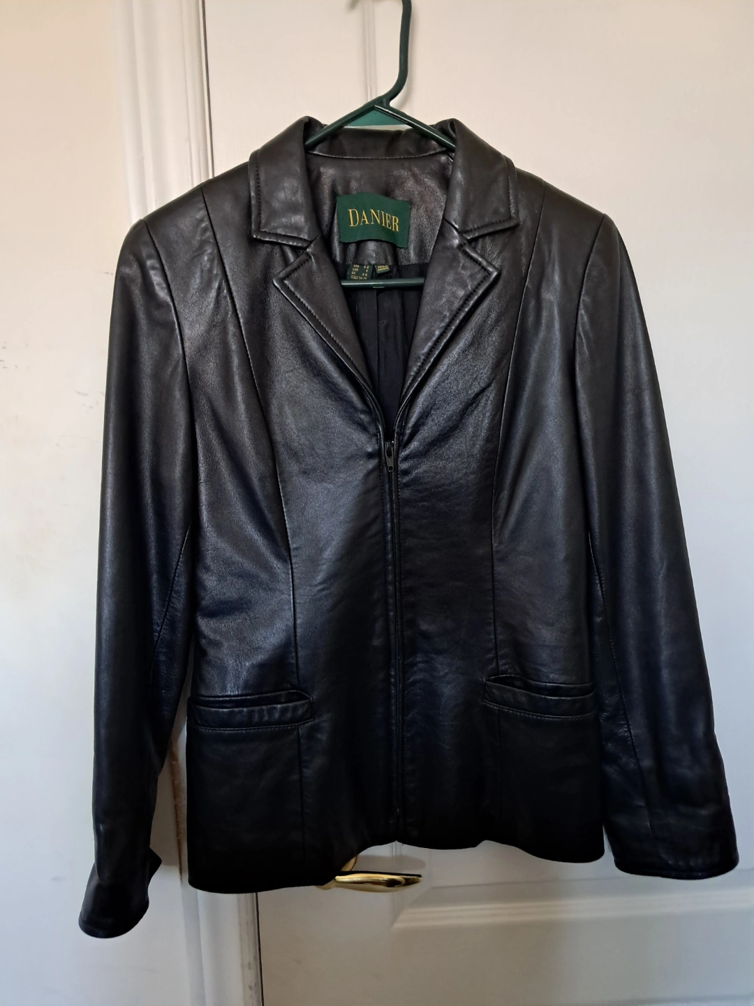 Women's black leather jacket. Experience timeless elegance with this black leather blazer jacket from Danier. Crafted from premium leather. front closure. Two front pockets. Classic style. Size 4 - 6