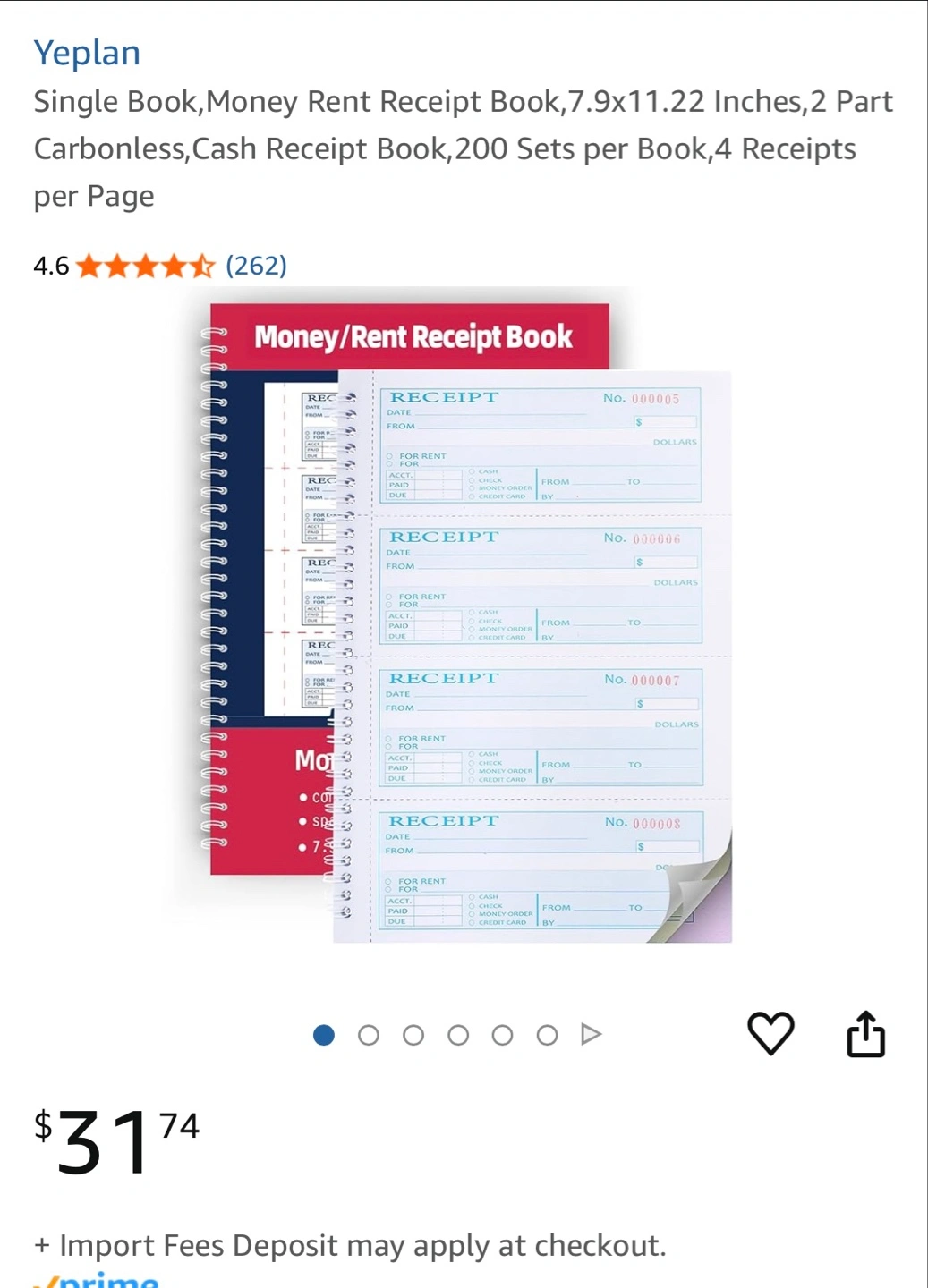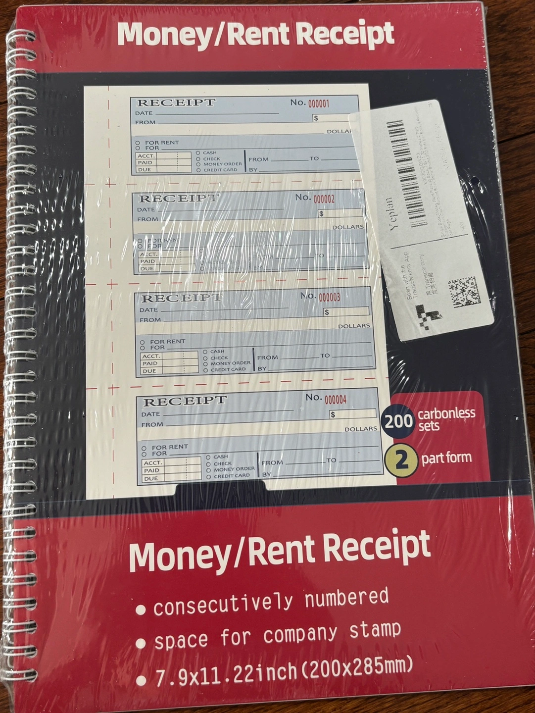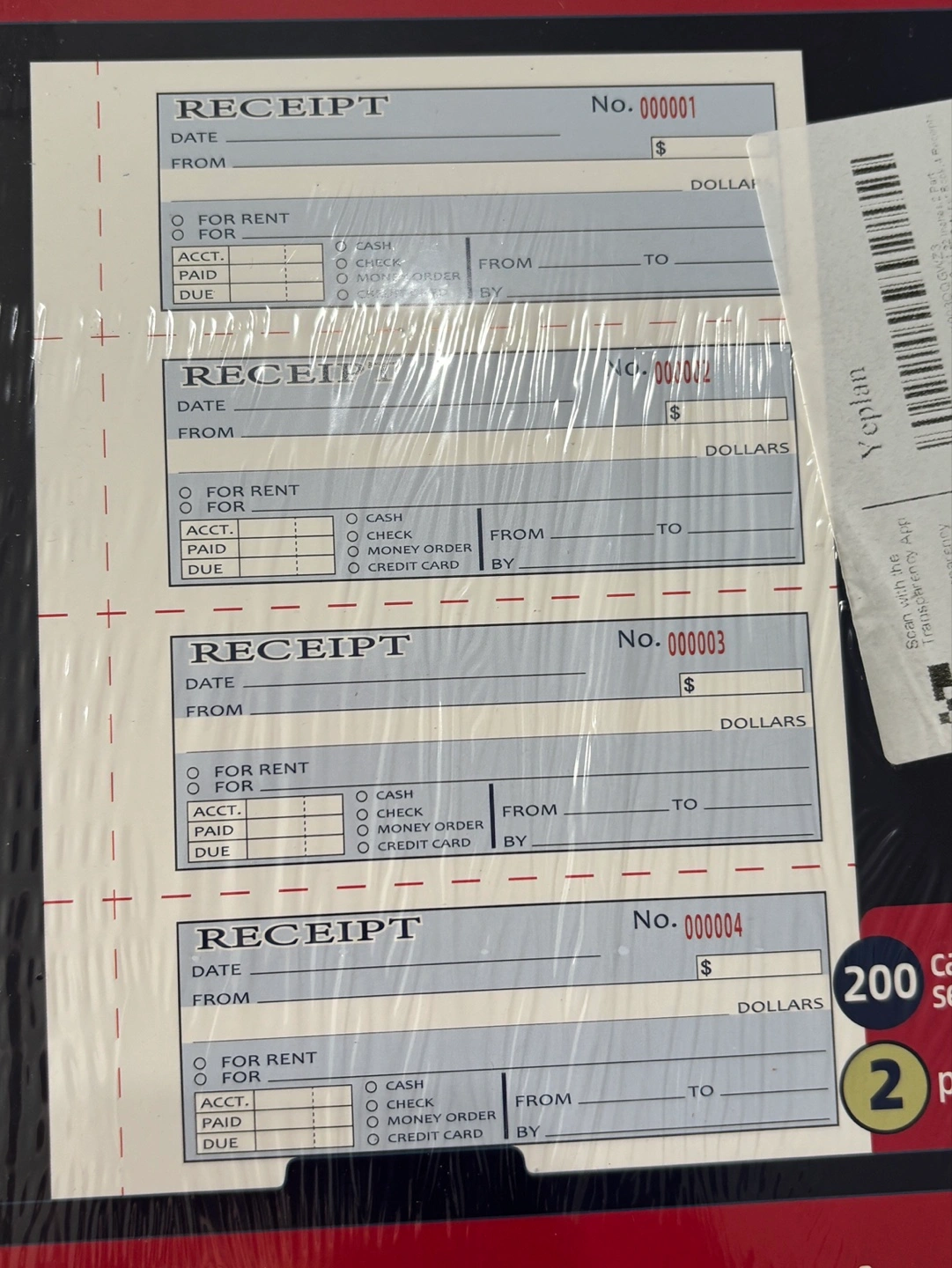 Carbonless receipt book. 2 part forms. 200 receipts .Consecutively numbered. Space for company stamp. 7.9x11.22 inch (200x285mm). 4 receipts per page.